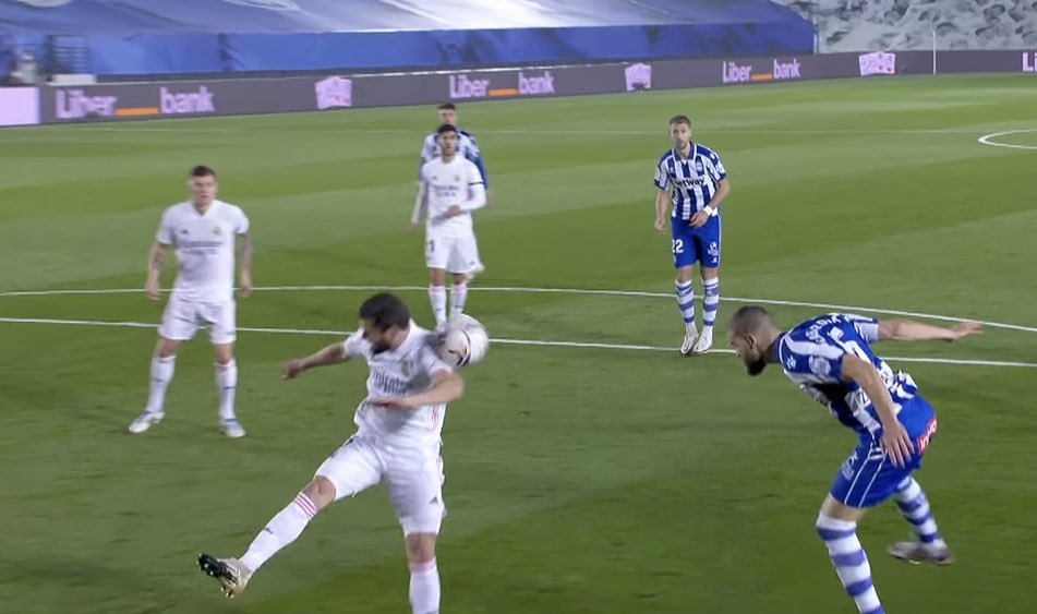 Dani Carvajal pone dos ejemplos en dos partidos del Real Madrid. La mano de Capa se produjo hace unos días, ante el Athletic de Bilbao. El defensa vasco intercepta un pase de Vinicius dentro del área y no se señala penalti. Sin embargo, hay otro ejemplo que pone Carvajal en el que sí se pitó penalti y es muy parecida a la acción de Ramos este domingo: la mano de Nacho Fernández en la derrota del Real Madrid ante el Alavés. Un centro lateral en el que la pelota rebasa al defensa blanco y la pelota, tras el remate del adversario, da en la mano de Nacho que no es consciente de nada.