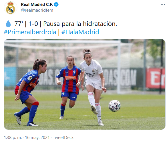 Pero hay un hecho curioso que no todo el mundo ha tenido en cuenta a la hora de emitir sus quejas y es que el propio Real Madrid tuvo su pausa de hidratación. Eso sí, en el partido del equipo femenino que se jugó por la mañana en Madrid frente al Eibar. El partido se paró en el minuto 77 con 1-0 y acabó con 2-0 para el equipo local.