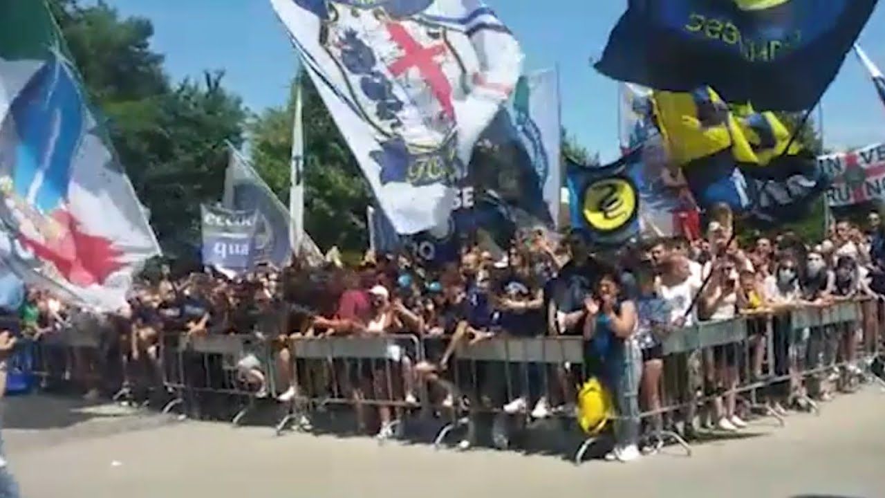 Los tifossi del conjunto neroazzurro no pararon de cantar cánticos con su nombre a lo que los futbolistas de la plantilla interista respondieron con una cariñosa ovación.