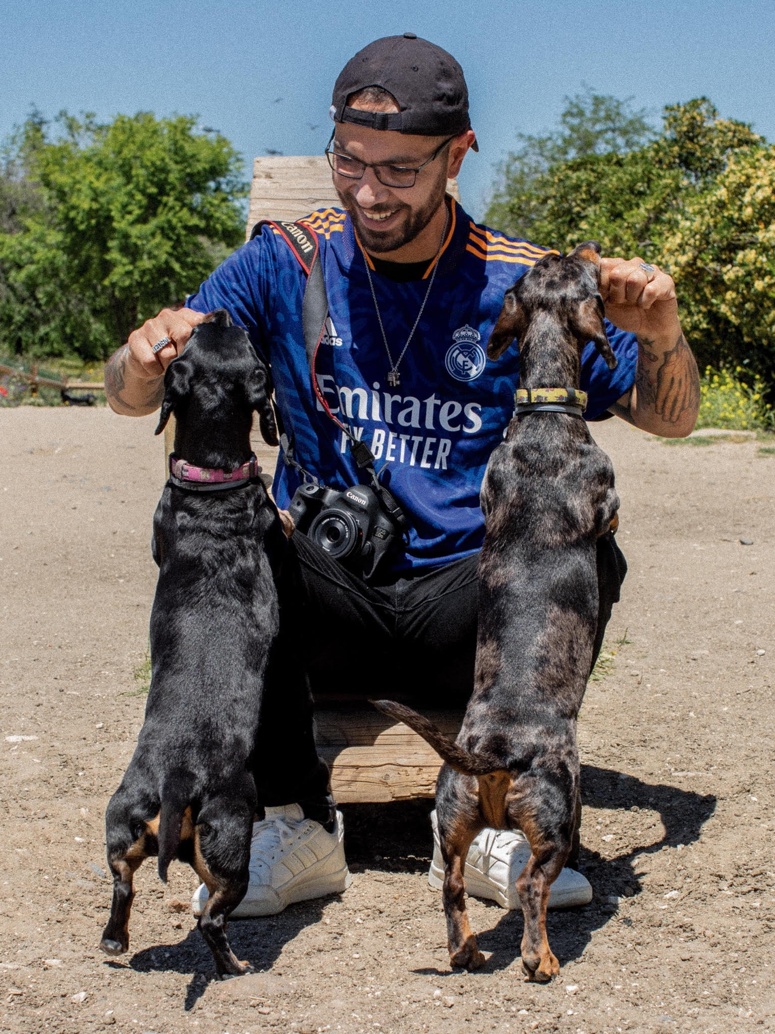 Criado en Villaverde Bajo, Jeosm jugaba al balompié en un descampado sitiado por yonquis y, aunque soñaba con ser como Butragueño, Pardeza y esa gente –la Quinta del Buitre pegaba fuerte por entonces–, se convirtió en carne de banquillo, “llenando el botijo de agua o jugando por ahí con los perros de los vecinos”. | En la imagen, Jeosm, con sus perros Charlie y Lola.