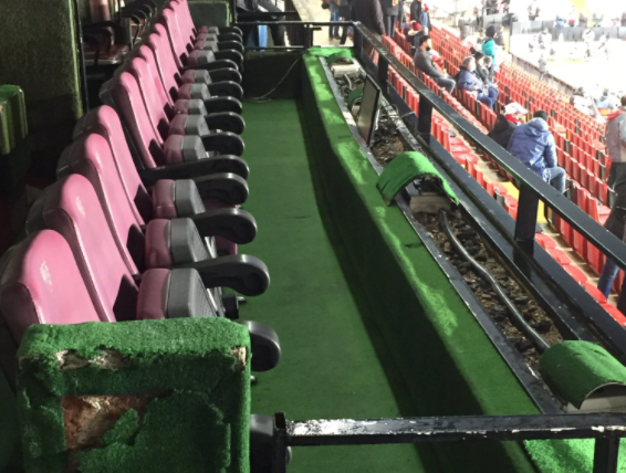 Como se puede apreciar en la imagen, el palco del estadio madrileño está en penosas condiciones. Casi todo el recubrimiento está levantado y se pueden ver incluso cables sueltos y tierra en la superficie del balcón del propio palco. En resumen, el estado del palco de uno de los estadios de la Primera División española es vergonzoso.