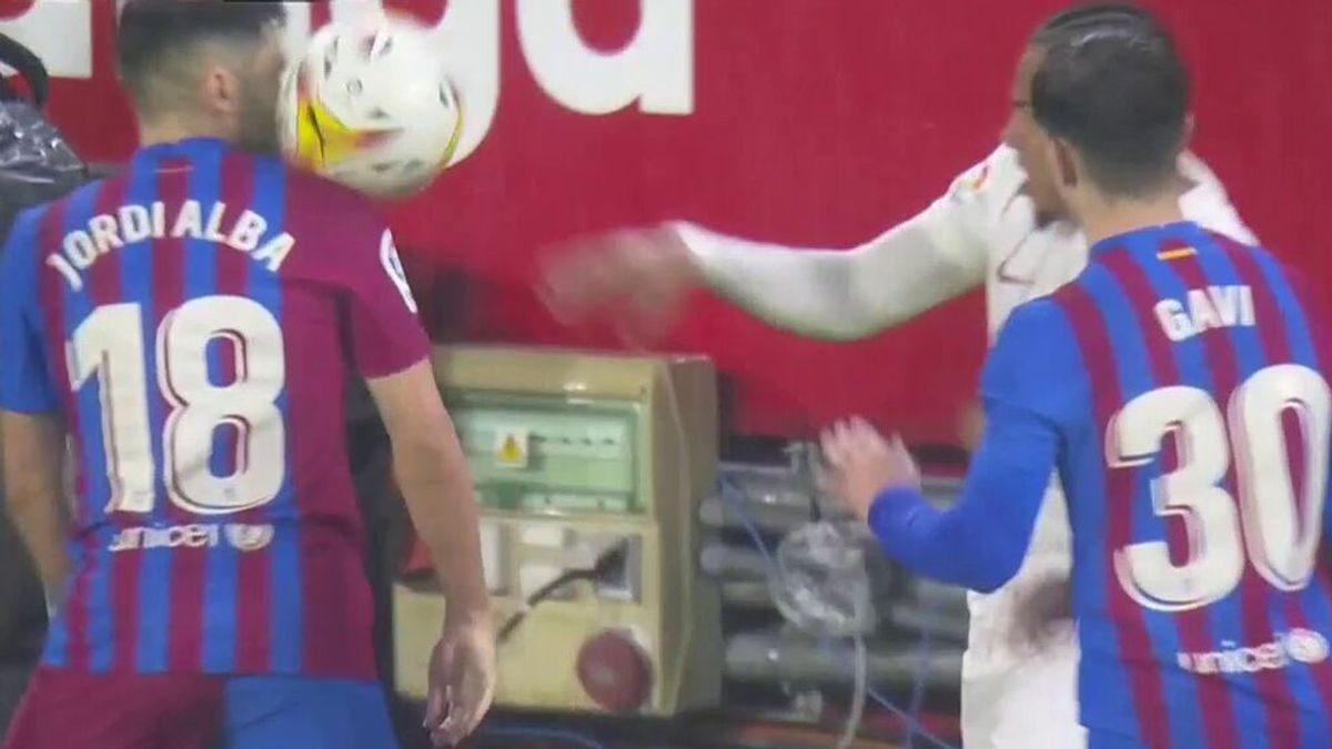 La jugada es digna de estudio y no precisamente por algo positivo. Primero porque es innecesario el toque/empujón de Alba que hace perder los nervios a Koundé y luego por el pelotazo en la cara que le da el sevillista al jugador azulgrana. Además, Alba exagera la acción lanzándose hacia atrás, mientras mira al colegiado, como si le hubiesen disparado en la cara.