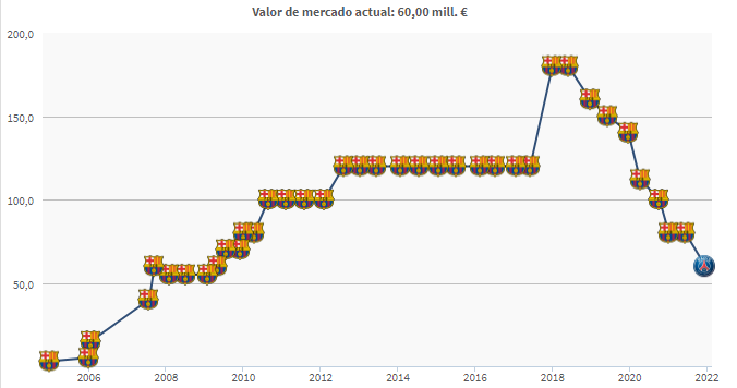 El argentino superó los 180 millones de valor en el año 2018, ese es el pico más alto que alcanzó, tras ello, y siendo la Liga 18-19 la última que ganara con el FC Barcelona, su valor comenzó a bajar considerablemente y en periodos muy cortos de tiempo.