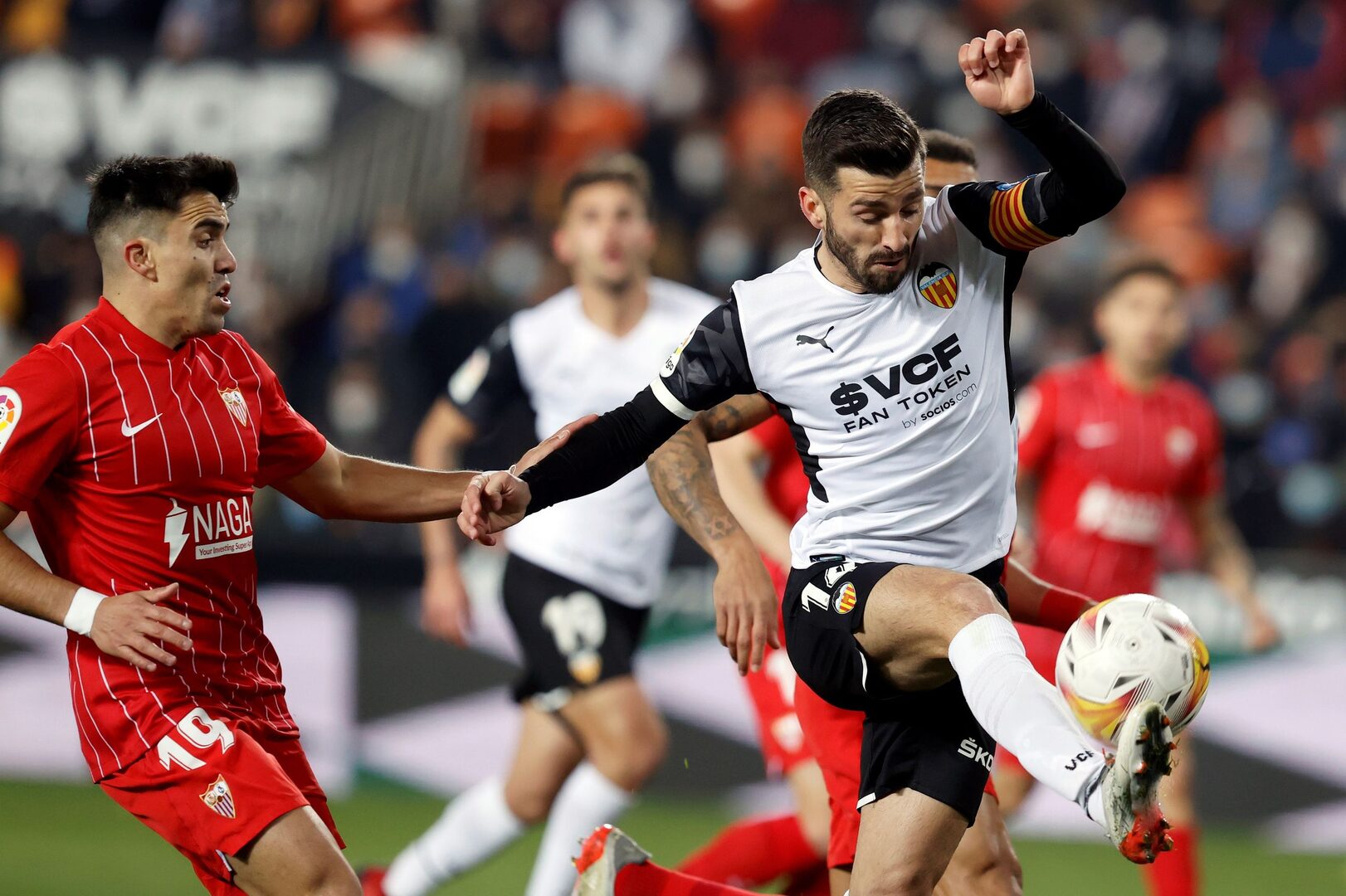 El partido se torció muy pronto para el Valencia y, en la primera aproximación a portería del Sevilla, Diakhaby se marcaba gol en propia puerta al intentar que el pase de Montiel no llegase al segundo palo donde Rafa Mir ya estaba preparado para el remate. Pero las desgracias no acabaron ahí para el cuadro local, el árbitro anulaba bien un gol de Gayà por fuera de juego y un minuto después se retiraba lesionado el meta neerlandés Jasper Cillessen, que poco antes había evitado el segundo del Sevilla remate de cabeza de Ocampos.