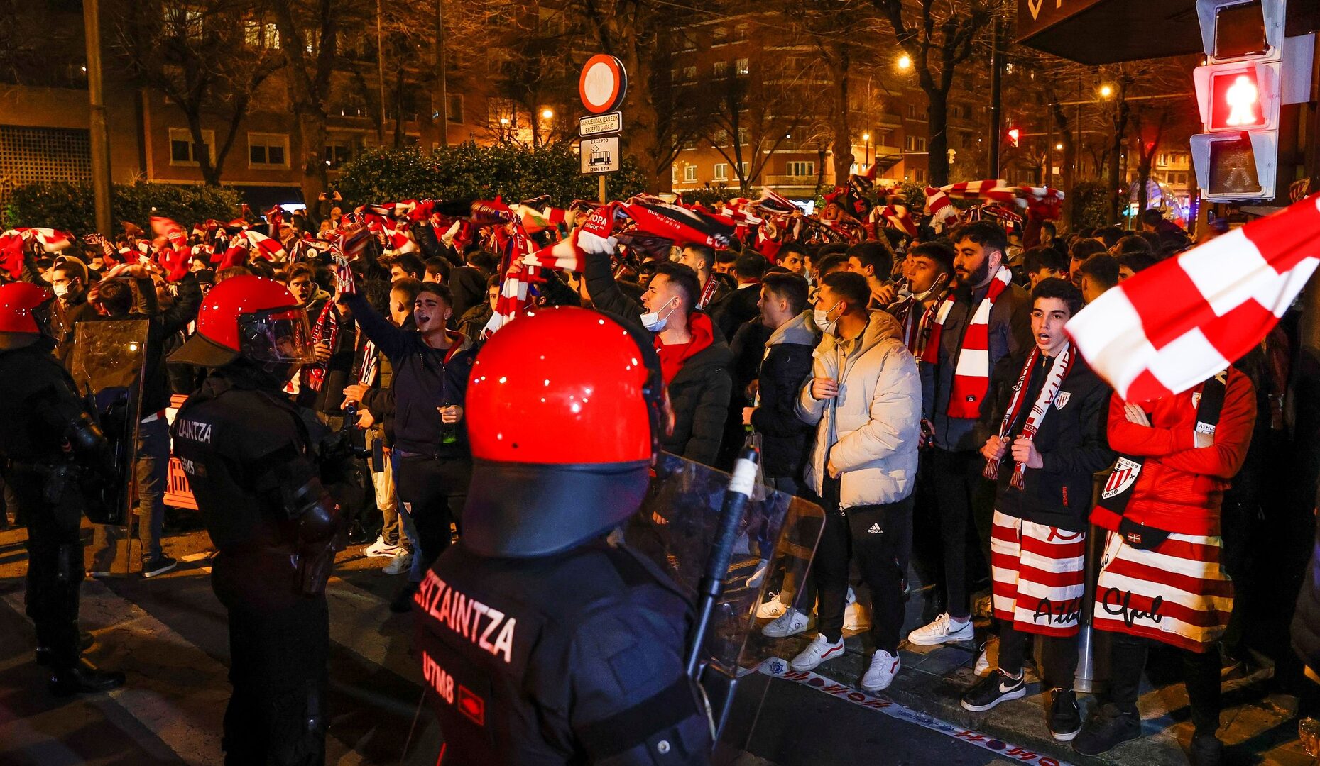 El Athletic Club llegó primero, a eso de las 20:00 horas, con gritos de apoyo y alguna bengala, pero cinco minutos después fue el Real Madrid el que fue recibido con insultos, botellazos y lanzamientos de objetos.