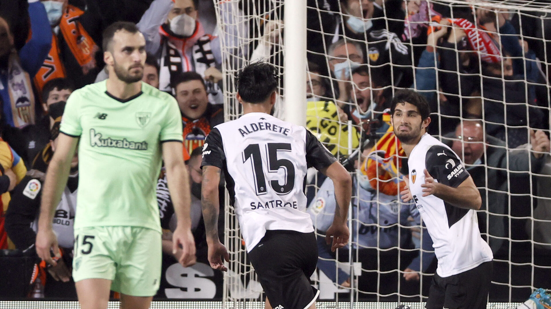 Sólo en una ocasión tuvo el Athletic una opción clara de gol cuando Iñaki Williams encaró la meta del Valencia, dribló a Paulista y obligó a Mamardashvili a lanzarse a sus pies y conjurar el peligro en una acción más que peligrosa. El equipo vasco falló su oportunidad y dio paso en uno de los contados ataques de los locales al 1-0. Tras un rechace defensivo, Guedes se hizo con un balón fuera de área, se lo colocó a su derecha y lanzó un disparo imposible de parar, que entró a la izquierda de Aguirrezabala. Era el minuto 43 de juego y aunque, motivado por el tanto, los locales tuvieron la oportunidad de hacer el segundo, el marcador ya no varió.