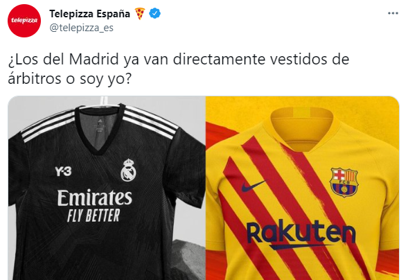 No parece una buena idea meterse con el Real Madrid teniendo en cuenta que es el equipo más laureado del fútbol español y que además tiene un impacto internacional que va más allá del deporte. Pero todo eso parece haberle importado poco a Telepizza o, como mínimo, a su responsable en redes sociales. En plena semana de Clásico entre Real Madrid y Barcelona, la cuenta oficial de la marca española ha decidido mandar una indirecta muy directa al club de Chamartín. La nueva equipación negra con la que jugarán el domingo y los árbitros ocupan el centro de esta desafiante broma.