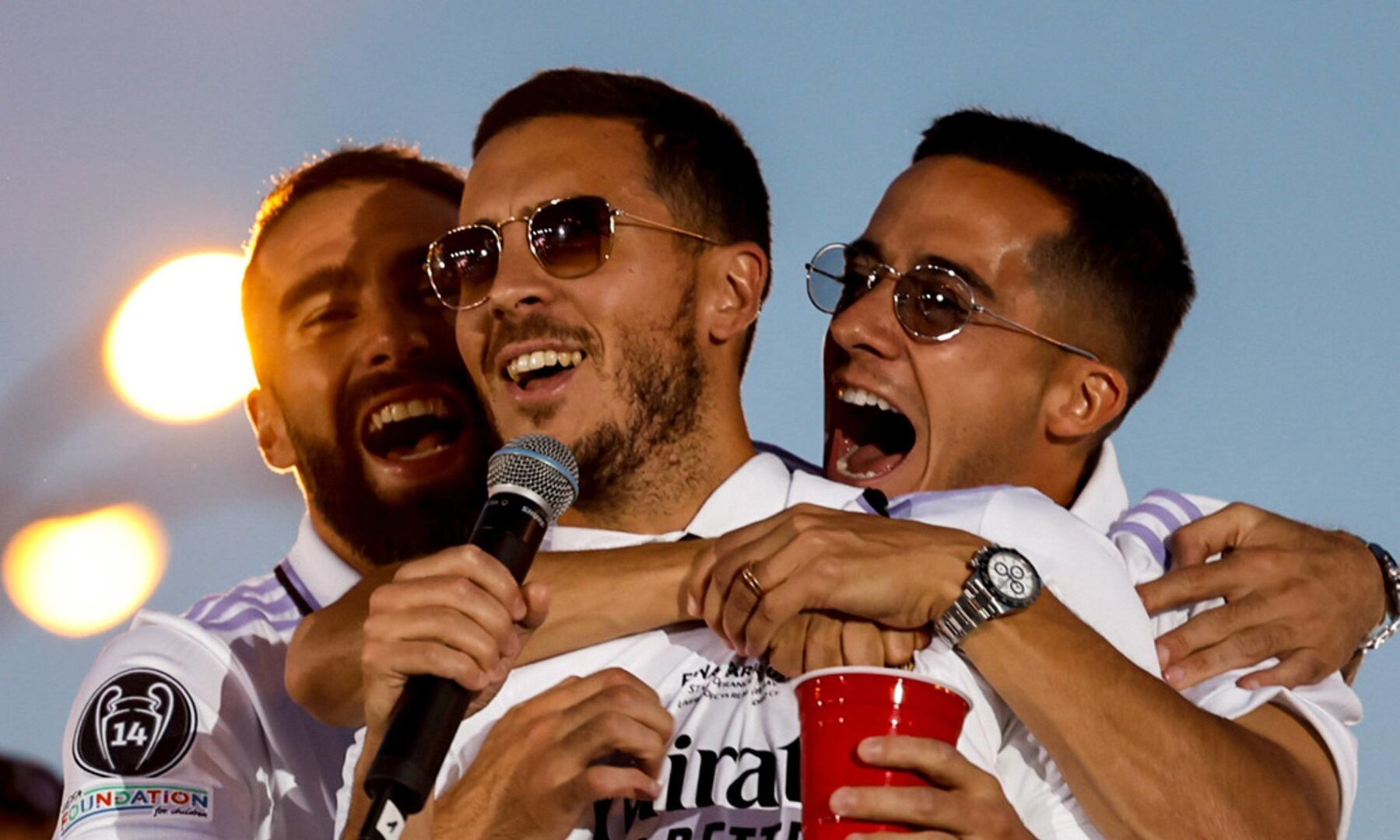 "Llevo tres años aquí, con lesiones y muchas cosas... pero prometo que el próximo año voy a darlo todo para vosotros", dijo Hazard en la celebración en Cibeles.