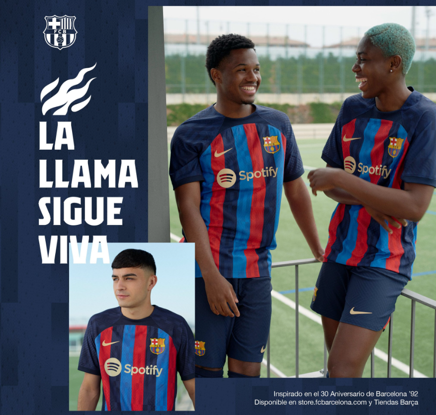 La nueva camiseta del FC Barcelona para la temporada 2022-23, con el estreno de los logos de Spotify en la parte frontal y de UNHR/ACNUR, en la dorsal, y que se ha presentado este viernes se inspira en la Barcelona Olímpica en el 30º aniversario de los Juegos del 92.