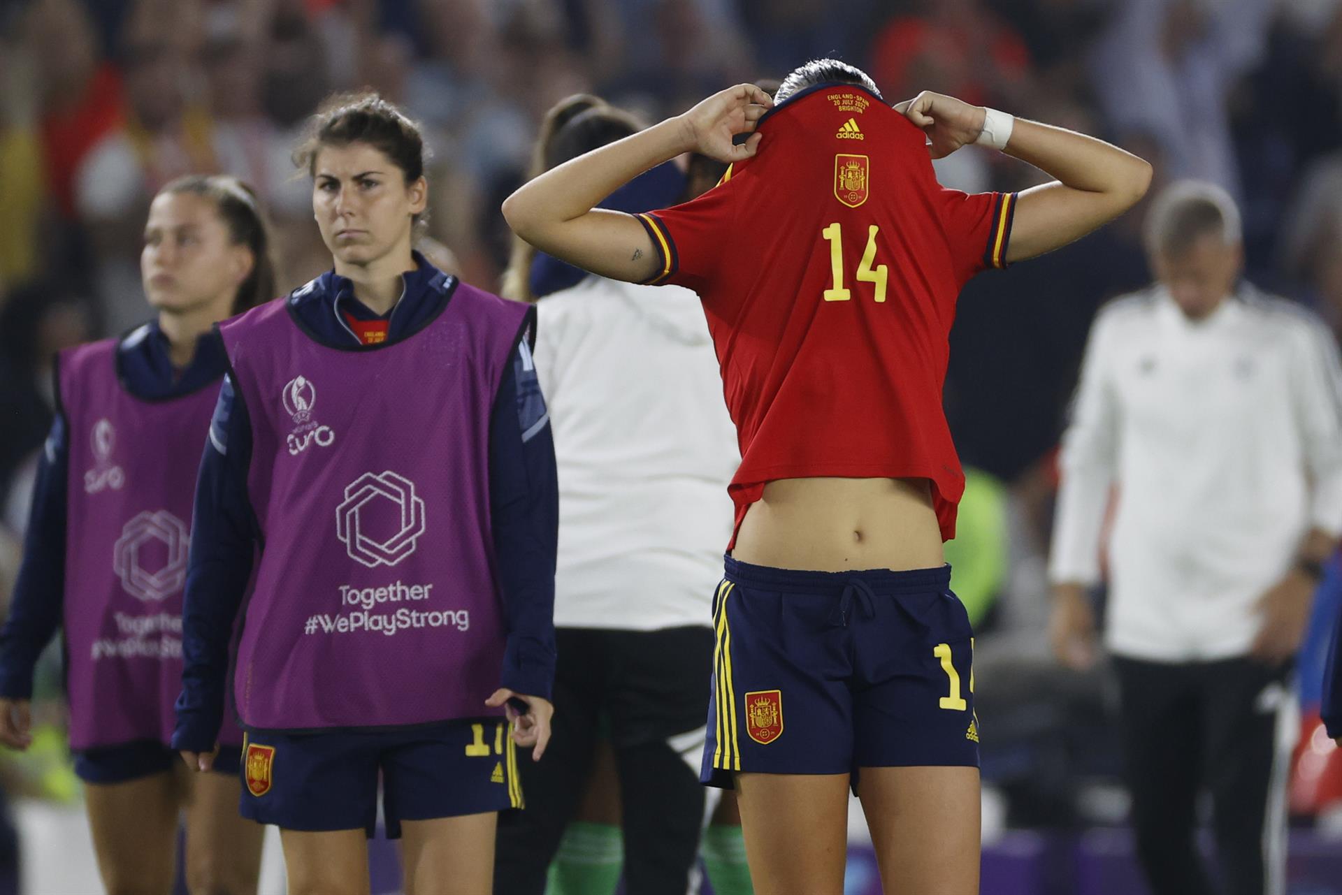 Inglaterra era favorita en la previa: jugaban en casa, habían hecho mejor torneo y no tenían bajas como las españolas, pero en el césped España fue superior durante gran parte del partido. La selección de Jorge Vilda arrancó el choque con mucha garra, algo que sorprendió a las inglesas y al público de Brighton. Poco a poco, las inglesas se entonaron y arropadas por la grada fueron creando situaciones de peligro cerca del área de Sandra Paños. Le anularon un gol a Helen White en el minuto 36 por fuera de juego tras una falta lateral que la delantera británica remató tras varios errores de la defensa en el despeje.