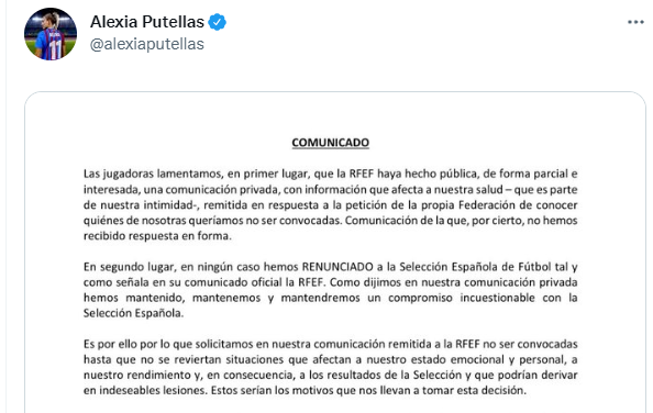 Las jugadoras lamentamos, en primer lugar, que la RFEF haya hecho pública, de forma parcial e interesada, una comunicación privada, con información que afecta a nuestra salud - que es parte de nuestra intimidad-, remitida en respuesta a la petición de la propia Federación de conocer quiénes de nosotras queríamos no ser convocadas. Comunicación de la que, por cierto, no hemos recibido respuesta en forma.