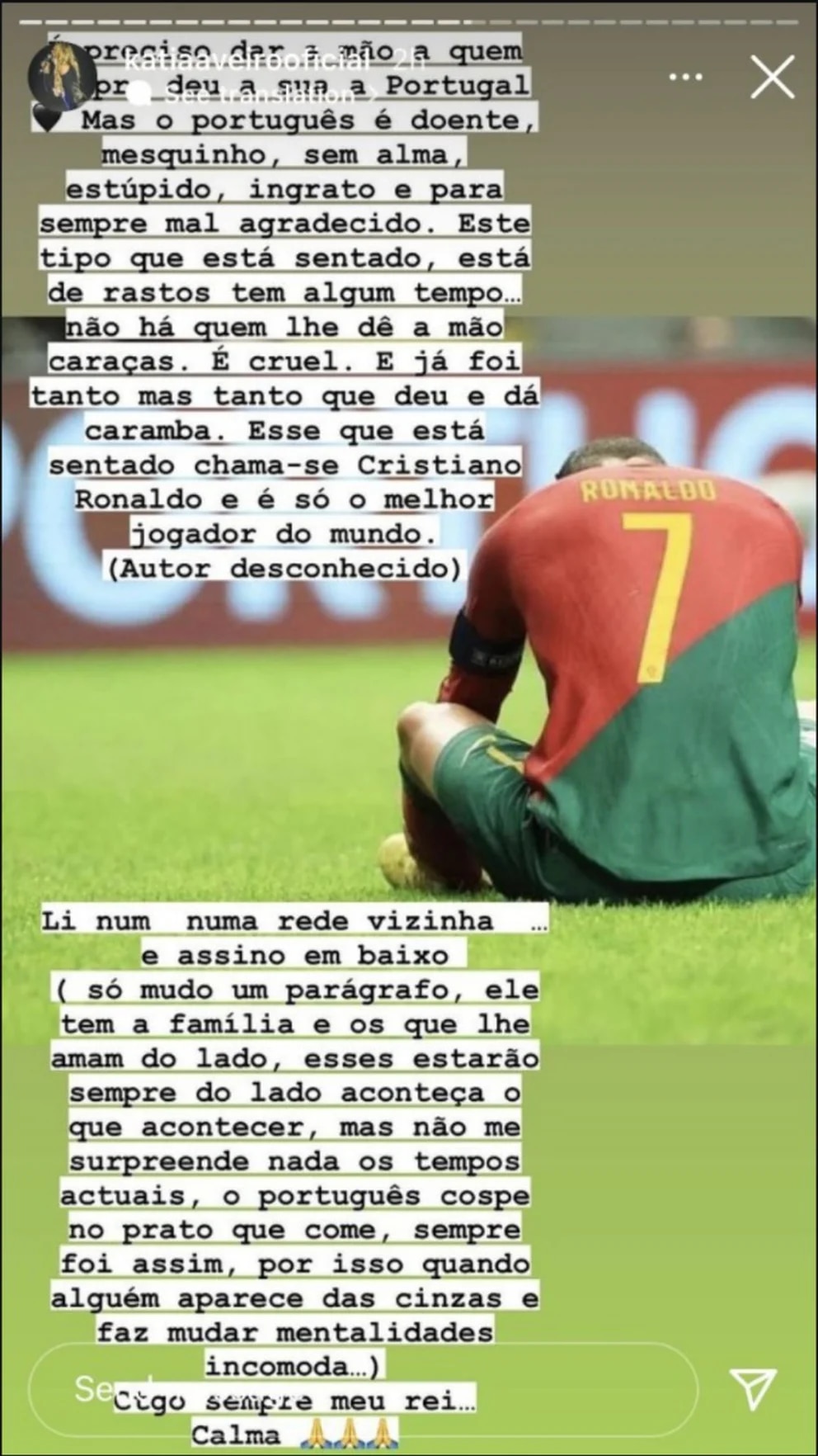 "Pero los tiempos actuales no me sorprenden en absoluto. Los portugueses escupen en el plato que comen, siempre ha sido así", disparo Kátia, quien aseguró que solo los seres queridos de Cristiano están siempre y pase lo que pase junto a él: "Tiene a su lado a su familia y a quienes lo aman. Siempre estarán a su lado, pase lo que pase. Por eso cuando alguien surge de las cenizas y cambia de mentalidad, molesta... Contigo siempre, mi rey. Cálmate".