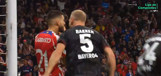Bakker, defensa del Bayer Leverkusen, se fue directamente a por Yannick Carrasco para restregarle en la cara que había fallado. Él y otro compañero, pero sobre todo él, se pusieron cara a cara con el belga que ni siquiera reaccionó ante su fallo desde la pena máxima. Tampoco lo hizo, por suerte, ningún compañero ya que la tangana final pudo haber sido un problema mayor.