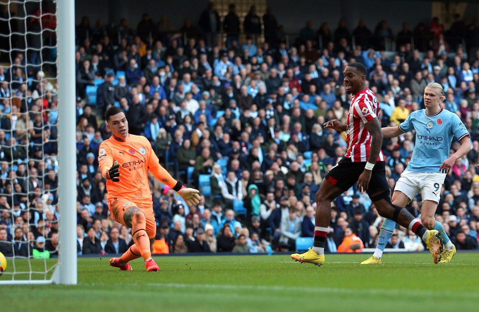 Con una actitud mucho más decidida, las abejas tuvieron dos mano a mano que salvó Ederson en los primeros seis minutos y acertaron a la tercera, una falta junto al centro del campo lanzada con un golpeo en largo por David Raya -una de las características que le llevan al Mundial con España- que prolongada por Ben Mee remató de cabeza Ivan Toney, a la espalda de Aymeric Laporte (m.16).