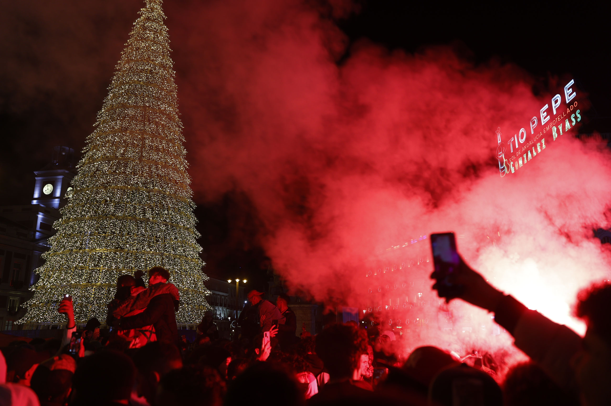 En la Puerta del Sol de Madrid se han congregado unos 600 aficionados marroquíes, algunos de los cuales protagonizaron altercados mientras cantaban "¿Dónde está Luis Enrique?". La Puerta del Sol, la Plaza de Callao y calles cercanas del centro de la capital se fueron llenando de hinchas marroquíes, que portaban banderas de su país y algunas bengalas.