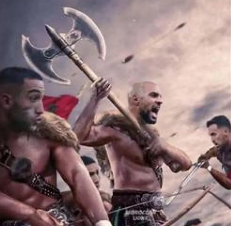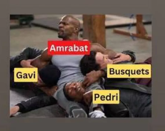 En las imágenes se puede ver a Amrabata con el cuerpo de Gavi en brazos mientras porta una espada y en otros montajes a varios jugadores españoles cogidos por el cuello.