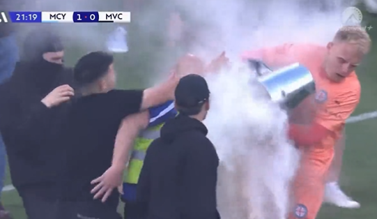 Debido al cambio de las finales de la A-League a Sidney, los ultras del Melbourne Victory saltaron al césped en el derbi ante el Melb City. Agredieron a su portero y al árbitro con una bengala.