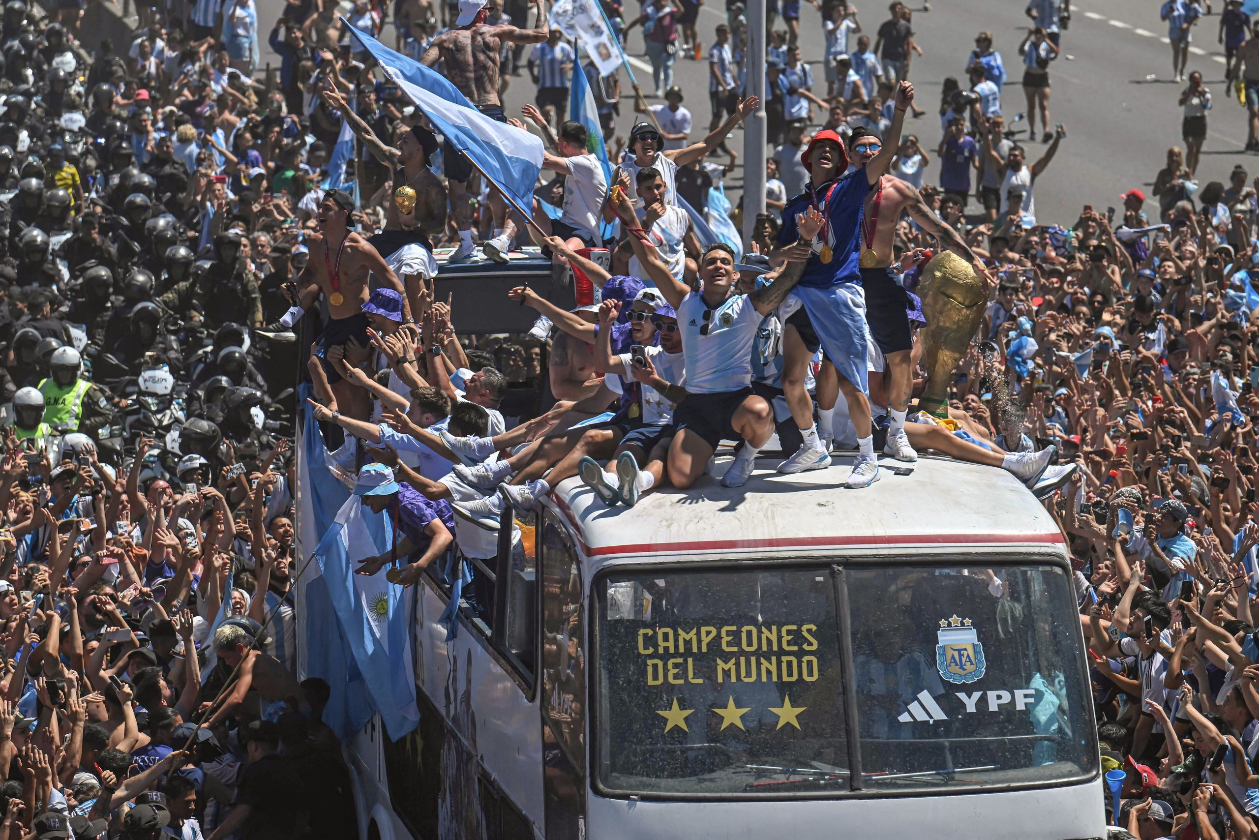 La situación es de locura absoluta y sin precedentes en Argentina. Se espera que más de 4 millones de personas se reúnan en el centro de Buenos Aires para festejar la llegada de los jugadores con la ansiada Copa del Mundo. Tal ha sido el colapso de las calles y de las autopistas, que los jugadores han tenido que ser evacuados en helicóptero una vez el autobús no podía avanzar.