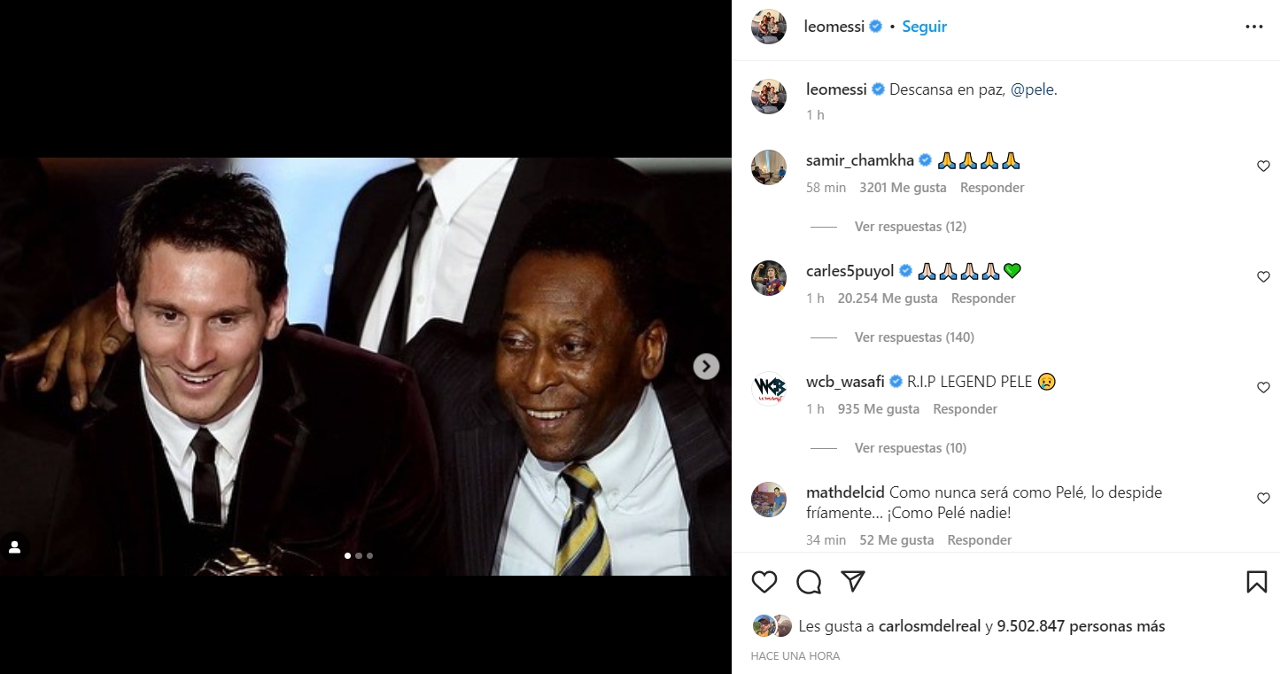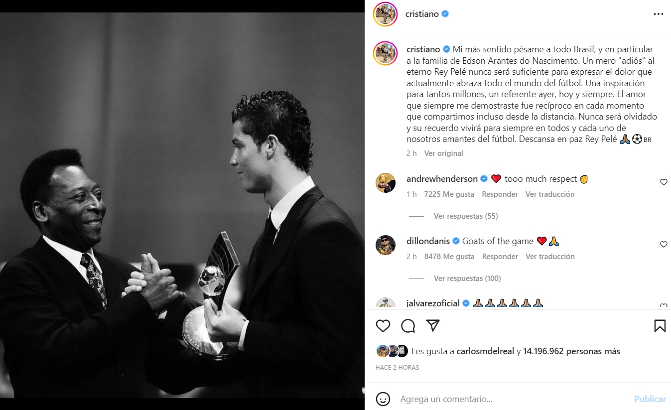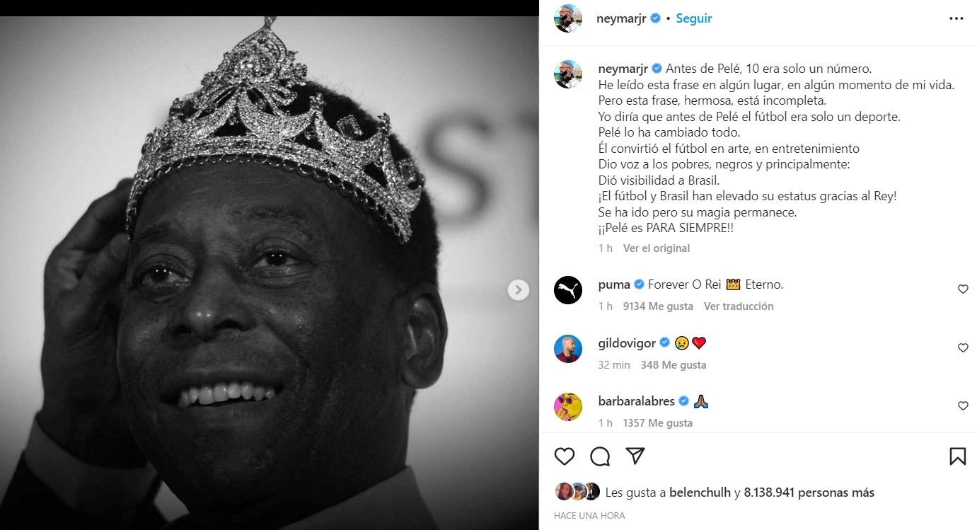 Se siguen sucediendo las reacciones a su muerte. Entre ellas destaca la de Neymar, quien ha puesto una publicación en Instagram con tres fotos: la primera de Pelé en blanco y negro y las otras dos unas imágenes junto a O Rei.