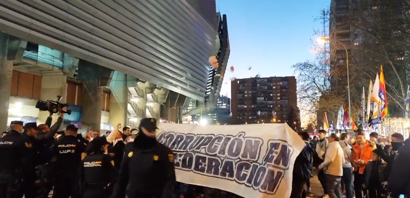 A pesar de que el club madridista no ha querido sumarse de manera oficial al comunicado de 40 de los 42 clubes de LaLiga condenando el caso Negreira, el feudo blanco recibió a los azulgranas como el territorio hostil que históricamente ha sido para ellos. "¡Corrupción en la Federación!", protestaron centenares de aficionados madridistas en las puertas del estadio antes del partido de Copa.