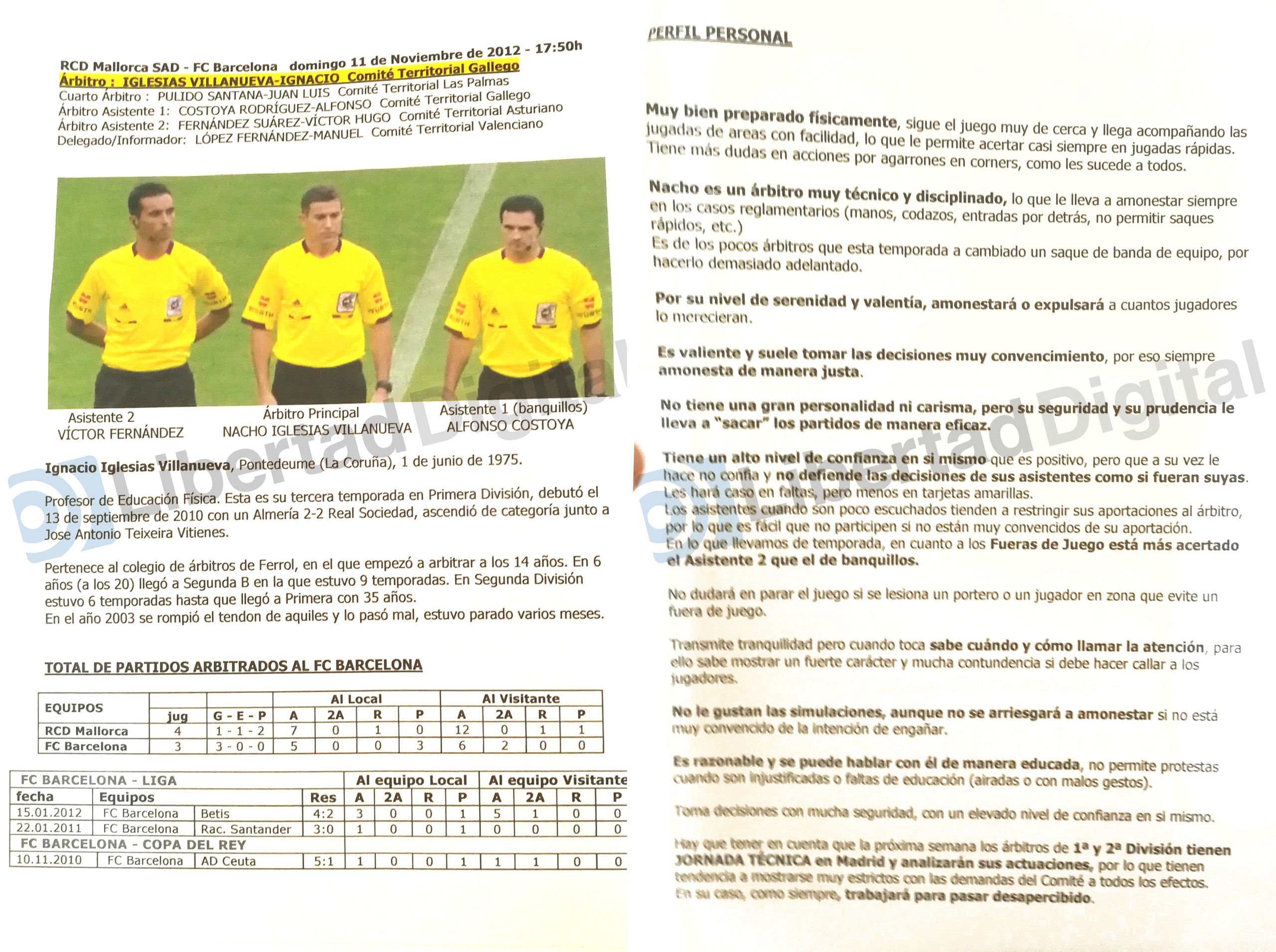 El informe de dos páginas repasa algunos datos profesionales de Ignacio Iglesias Villanueva, sus estadísticas en los partidos arbitrados al F.C. Barcelona y al Mallorca. De los 3 partidos arbitrados al Barça, los 3 se saldaron con victoria: en Liga el Barcelona-Betis 4-2 (15-1-2012), el Barcelona-Racing de Santander 3-0 (22-1-2011), y en Copa del Rey Barcelona-Ceuta 5-1 (10-11-2010). De los cuatro partidos arbitrados al Mallorca, uno acabó en victoria, uno en empate y dos en derrota.