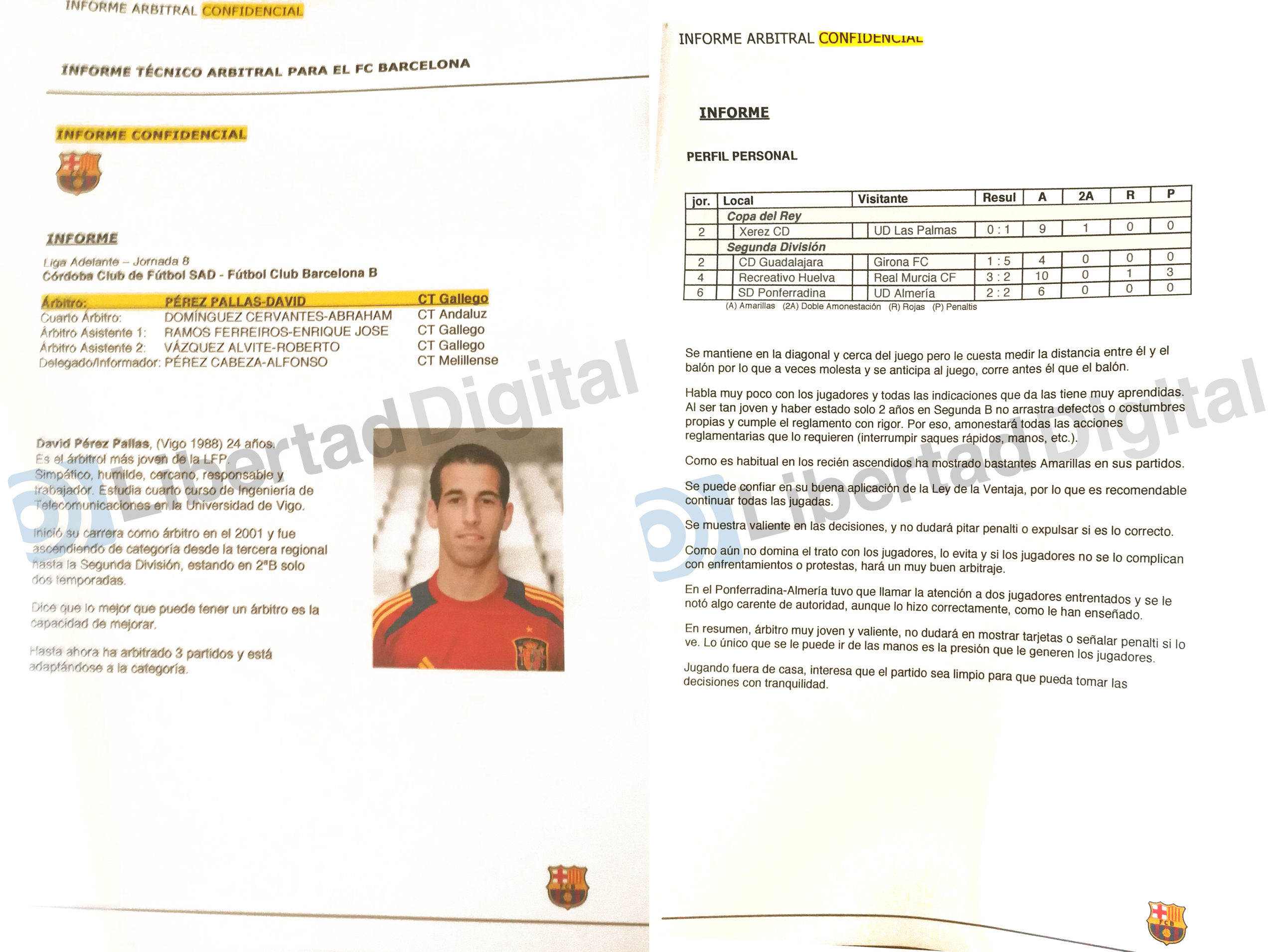 Los informes de Negreira que publica LD tienen un epígrafe en su encabezamiento donde se puede leer "Informe arbitral confidencial". Estos documentos con el membrete del F.C. Barcelona fueron incautados durante un registro domiciliario al que fuera histórico directivo del club blaugrana, Josep Contreras, fallecido el pasado mes de diciembre.