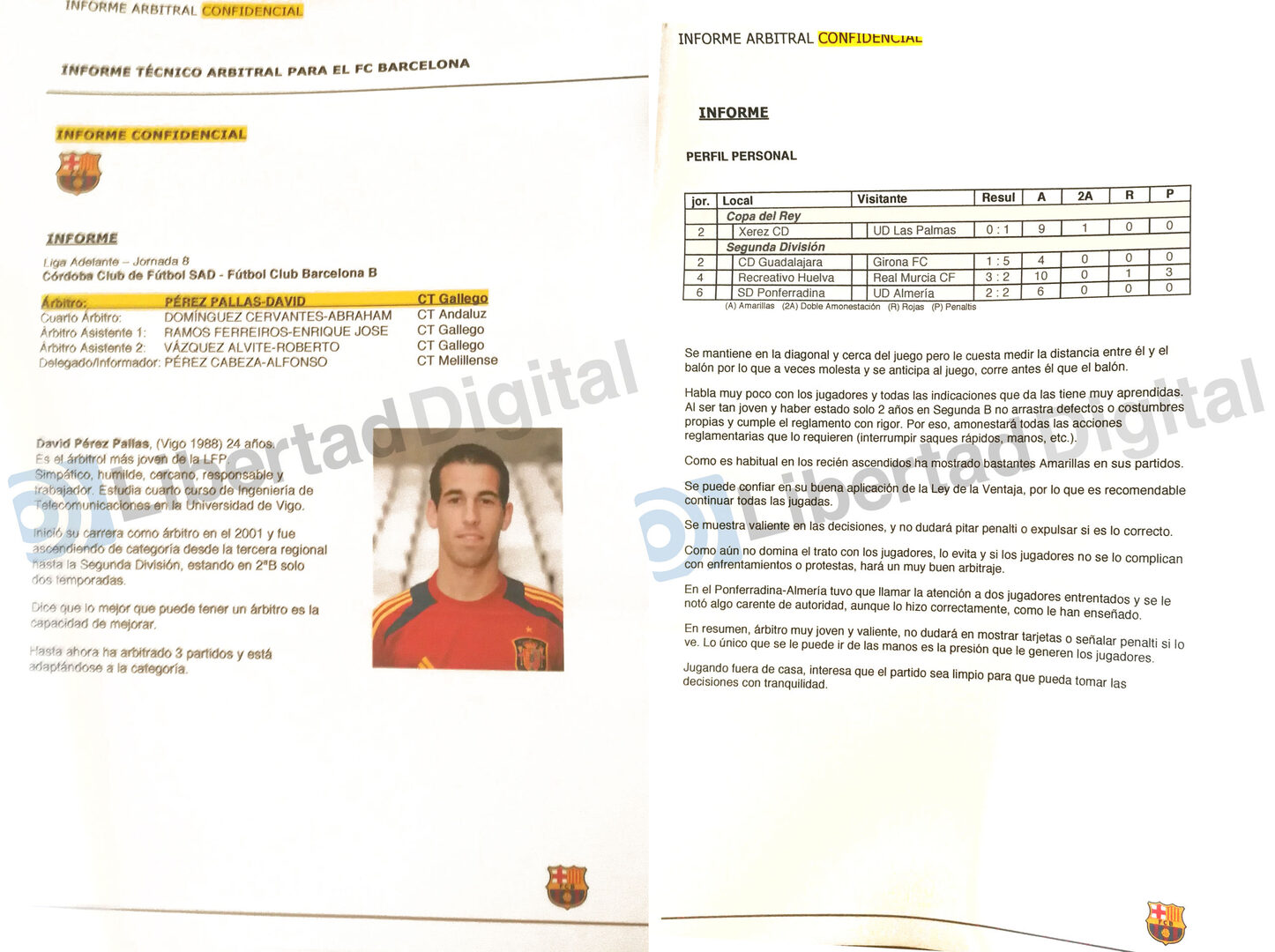 Los informes de Negreira que publica Libertad Digital tienen el encabezamiento de "Informe arbitral confidencial" con el membrete del F.C. Barcelona. Estos documentos fueron incautados durante un registro domiciliario al que fuera histórico directivo del Barça, Josep Contreras, fallecido el pasado mes de diciembre.