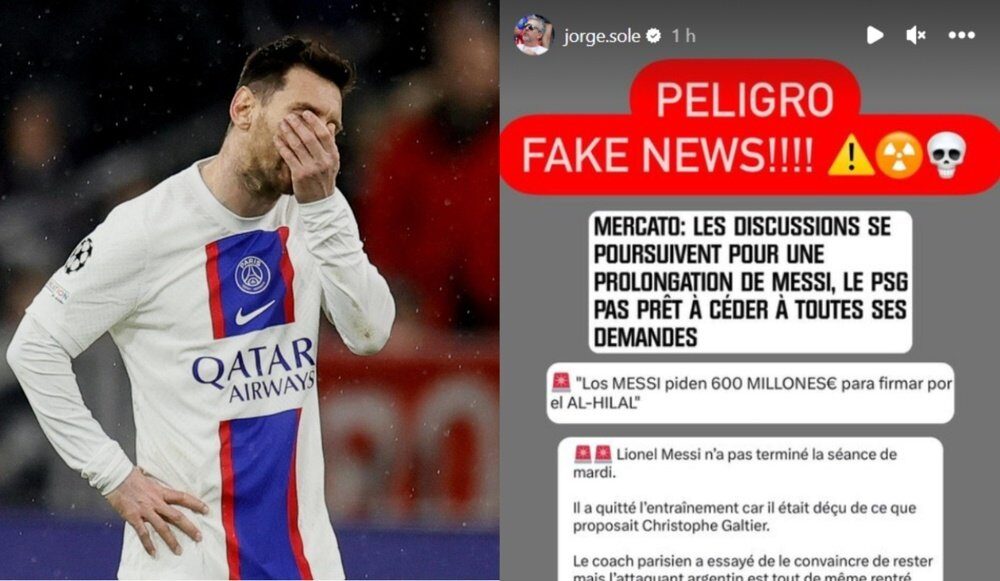 Este fue el mensaje que publicó en sus historias de Instagram Jorge Messi, haciendo referencia a tres informaciones. La primera tenía que ver con unas negociaciones con el PSG en relación con la renovación del futbolista: el club no estaría dispuesto a ceder a todas las pretensiones de Messi. La segunda noticia aseguraba que los Messi habían pedido 600 millones de euros al Al-Hilal para marcharse a Arabia Saudí. Esta última la hizo pública Jaime Astrain en el Chiringuito.