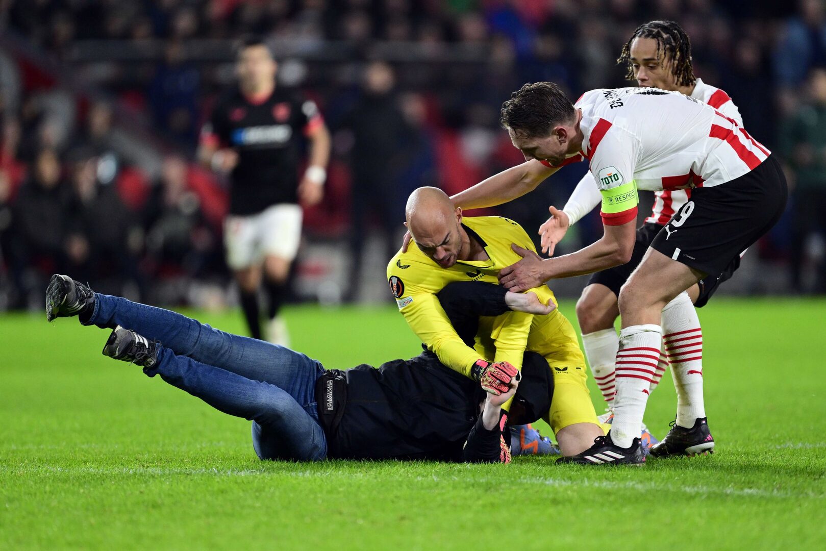 El joven, de 20 años, entró corriendo en el terreno de juego en la recta final del partido y golpeó en la espalda a Dmitrovic, antes de intentar darle un puñetazo en la cara. Rápidamente, el guardameta se abalanzó sobre él y lo inmovilizó en el suelo, mientras llegaron los miembros de seguridad. El PSV ganó el partido por 2-0, pero cayó eliminado de la Europa League por un global de 3-2 (los andaluces habían ganado por 3-0 en la ida).