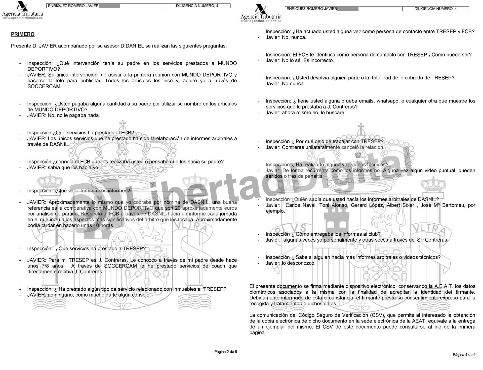 A Continuación, el hijo de Negreira era preguntado por los inspectores de Hacienda sobre sus servicios prestados al F.C. Barcelona. Javier Enríquez afirma que elaboraba informes arbitrales y que tenían un valor aproximado de 20 euros cada uno: