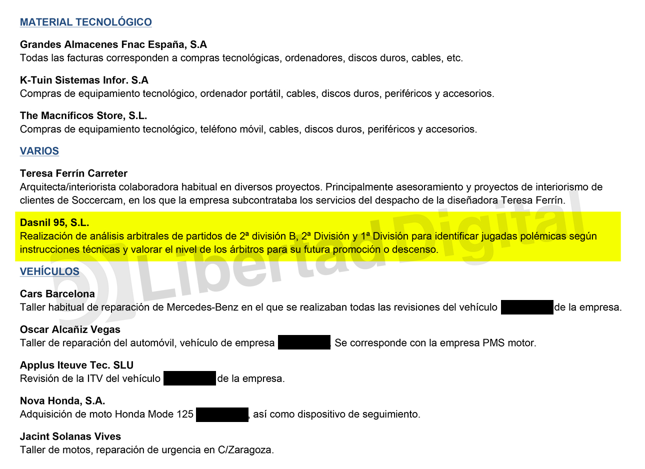 Un documento titulado "Soccercam abril 2021 descripción de compras y servicio", recogido en el sumario del caso Negreira al que ha tenido acceso Libertad Digital, desglosa numerosos gastos y facturas a petición de Hacienda en distintos epígrafes: "material tecnológico", "varios", "vehículos", "reformas y mantenimientos despacho", "recursos despacho" y "hoteles".