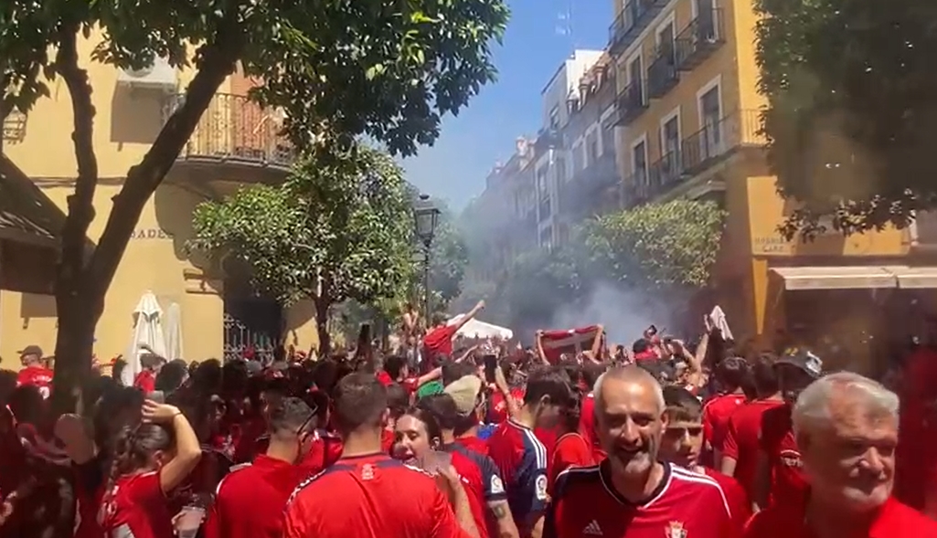La afición de Osasuna ha dado color a las calles de Sevilla mientras espera la hora del inicio de la final de la Copa del Rey contra el Real Madrid en el estadio de La Cartuja.