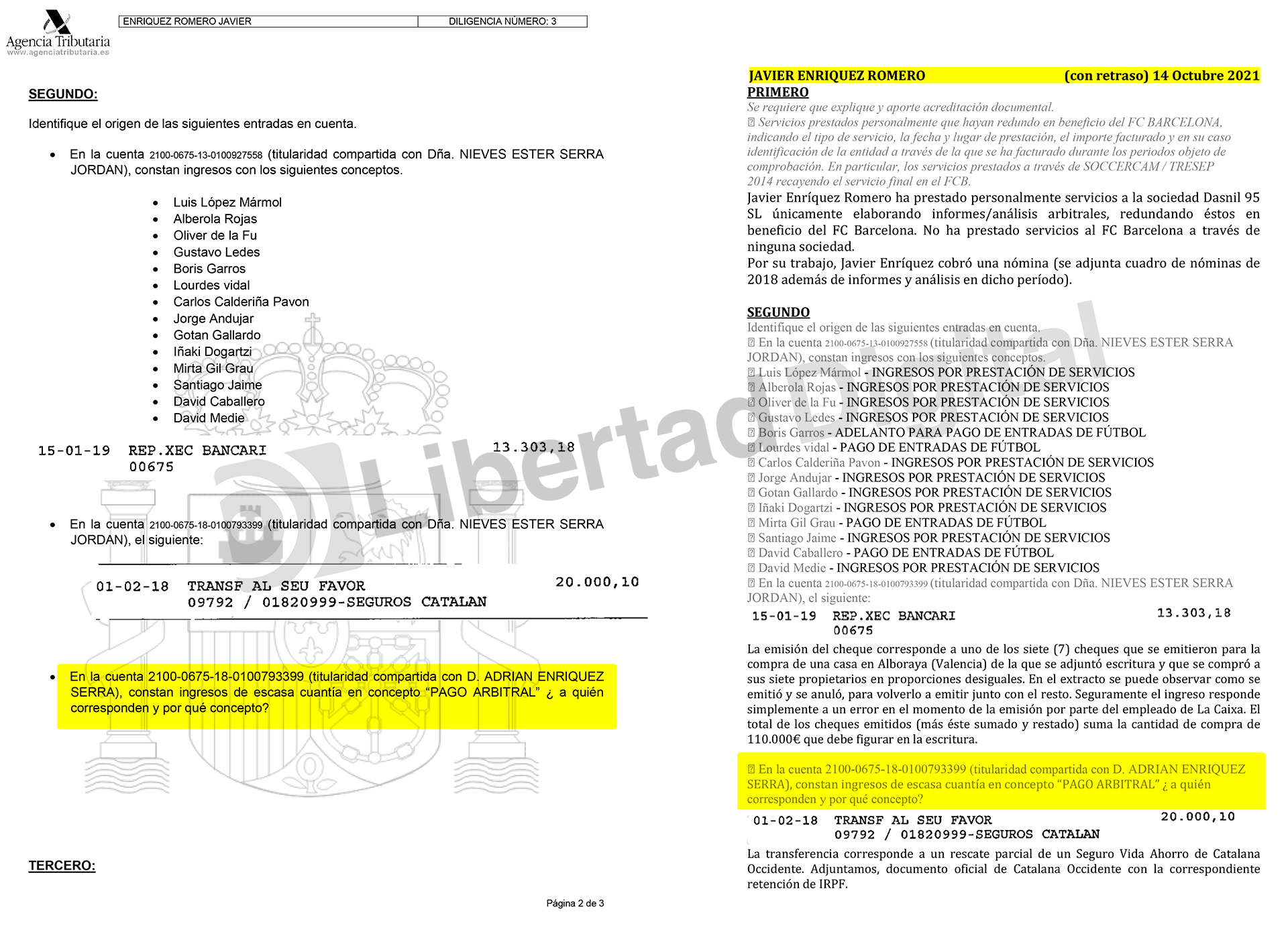 En la misma diligencia de investigación, la Agencia Tributaria afirma que "en la cuenta 2100-0675-18-0100793399 (titularidad compartida con D. ADRIAN ENRIQUEZ SERRA), constan ingresos de escasa cuantía en concepto ‘PAGO ARBITRAL’". A continuación, pregunta al hijo de Negreira "¿a quién corresponden y por qué concepto?".