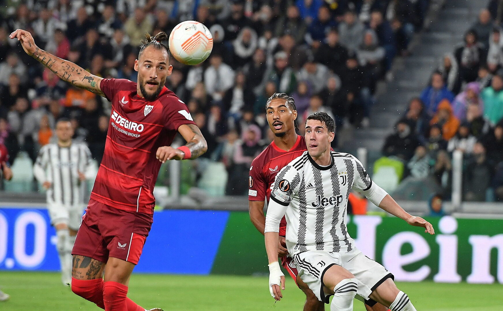 Plagado de grandes futbolistas, el equipo que entrena Massimiliano Allegri no pudo contar en esta ocasión por lesión con el central brasileño Gleison Bremer y se unió también por lesión de larga duración a la de de Sciglio. Sí estaban jugadores como el veterano Leonardo Bonucci o gente arriba de la calidad de Di María o Dusan Vlahovic y ante ellos Mendilibar sacó un equipo muy titular, pese a que se quedara en Sevilla lesionado el extremo Suso Fernández o el centrocampista senegalés Pape Gueye, éste al no estar inscrito en la competición continental.