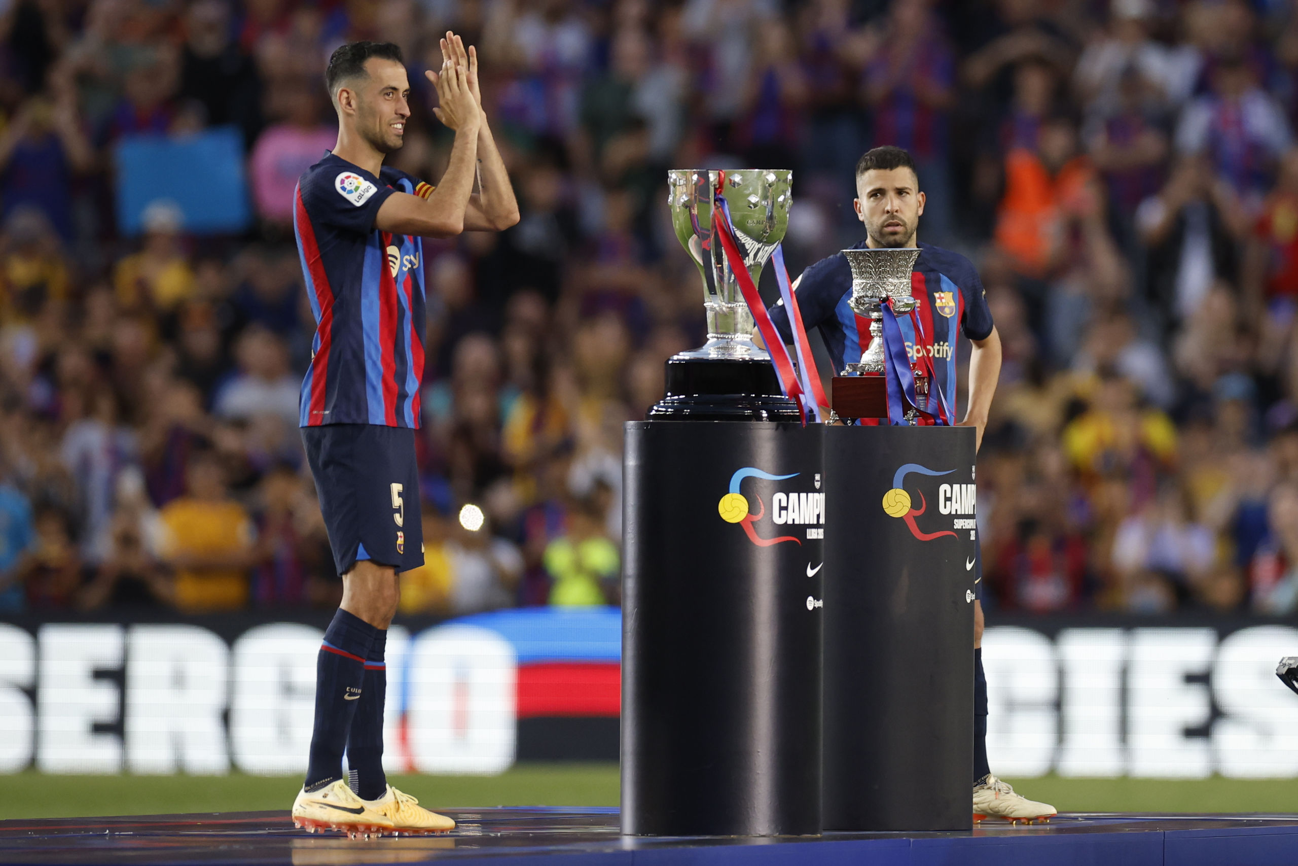 Un Spotify Camp Nou repleto coreó el mítico "Campeones" y no se olvidó de entonar los nombres de las dos leyendas que se han despedido este domingo del coliseo azulgrana: Sergio Busquets y Jordi Alba.