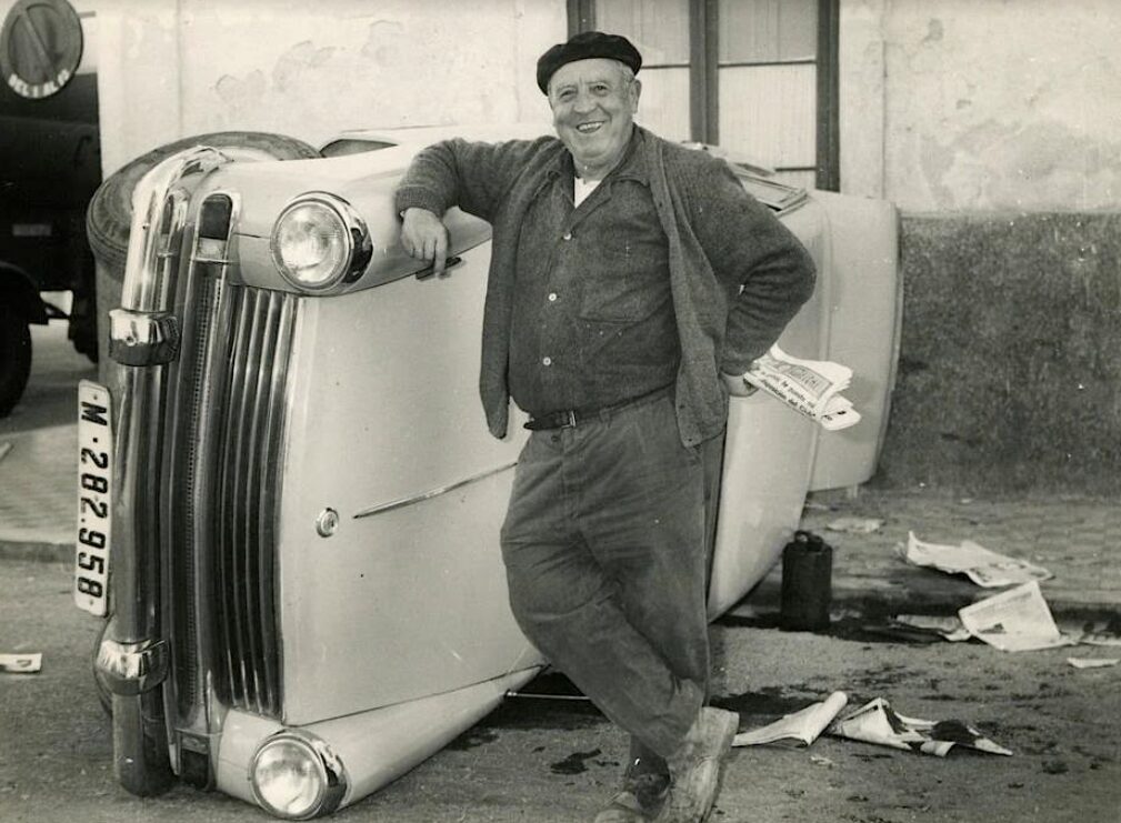 No había hecho más que nacer ese por tantas cosas memorable año 68, cuando va a producirse un suceso que bien pudo cambiar la historia del Real Madrid, aunque al final se quedara únicamente en un susto y en una curiosa anécdota. En una de sus frecuentes estancias en la localidad alicantina de Santa Pola, donde el patriarca madridista poseía una casa y una barca de pesca, Santiago Bernabéu sufrirá un aparatoso accidente de tráfico al estrellarse su automóvil, un Morris con matrícula M-282.958, contra un camión cisterna, pero saliendo el presidente merengue por fortuna completamente ileso, y con el buen humor de dejarse fotografiar junto al vehículo volcado, exhibiendo una amplia sonrisa, tocado con una boina y ataviado con ordinarias ropas de faena, como un paisano cualquiera.