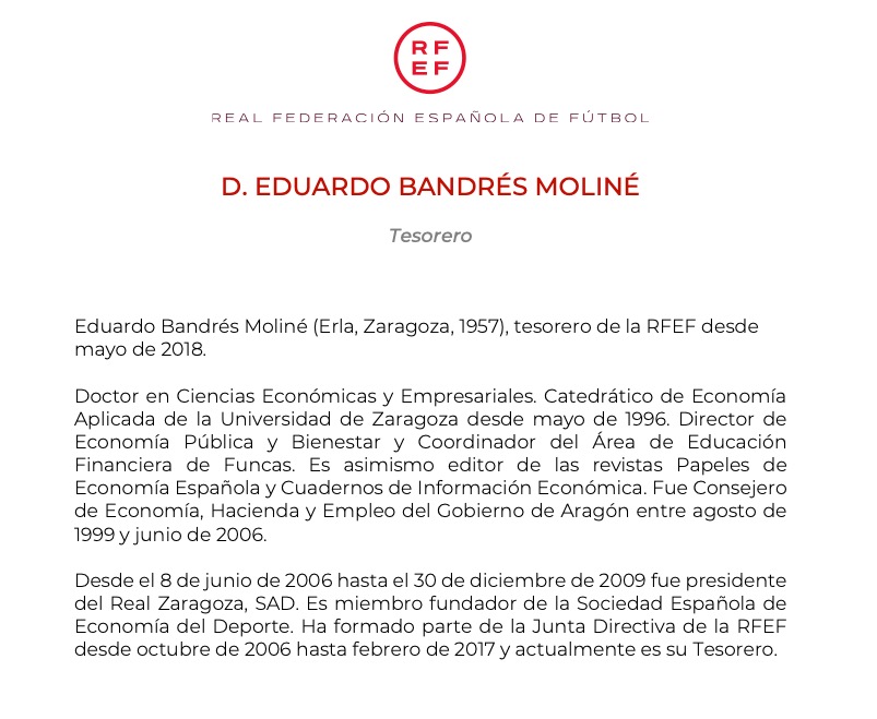 La Real Federación Española de Fútbol recoge en su documentación, tanto la actual posición de Eduardo Bandrés Moliné, como su CV. Es nada menos que el "tesorero de la RFEF desde mayo de 2018". Y no duda esa misma documentación en destacar su plena vinculación con el PSOE: "Desde 1999 a 2006 fue diputado por el PSOE en las Cortes de Aragón, siendo también Consejero de Economía, Hacienda y Empleo del Gobierno de Aragón". Su papel en el fútbol se pronunció, de hecho, a raíz de aquellos contactos.