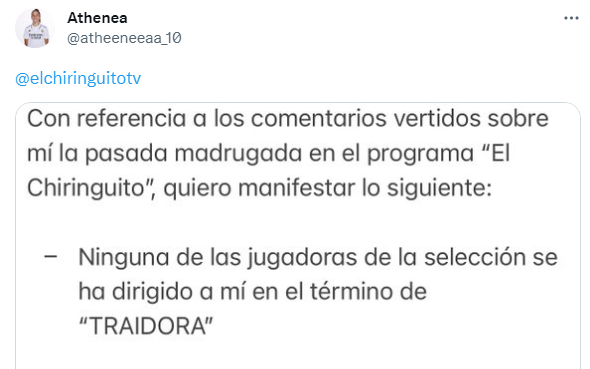 "Ninguna de las jugadoras de la selección se ha dirigido a mí en el término de 'TRAIDORA'. En su día, adopté una postura diferente a la mayoría de mis compañeras. Así se lo manifesté en su momento a ellas y lo hice público a través de un comunicado en el que dejaba clara mi opinión. Más allá de esa declaración, ni yo ni NADIE de mi círculo de confianza hemos hablado sobre esta situación con ninguna persona fuera del mismo. Por este motivo, rogaría que no se especulase sobre mi estado anímico, ni nada al respecto", comentó Athenea en su cuenta de Twitter.