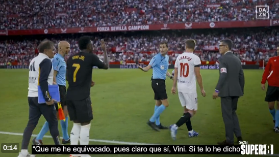Sigue coleando la actuación de De Burgos Bengoetxea en el choque que enfrentó a Sevilla y Real Madrid el pasado fin de semana y que finalizó con empate a uno entre sevillistas y madrileños. Además, siguen llegando imágenes del partido y en una de las mismas, emitida por DAZN, se puede ver al colegiado reconociendo un error mientras habla con Vinícius.
