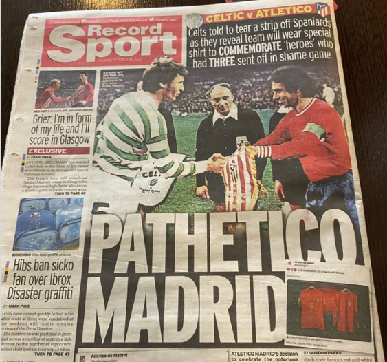 Este hecho conmemorado por el Atlético de Madrid, no parece haber hecho demasiada gracias en Escocia ya que el periódico Record Sport ha calificado de Pathetico Madrid al conjunto rojiblanco.