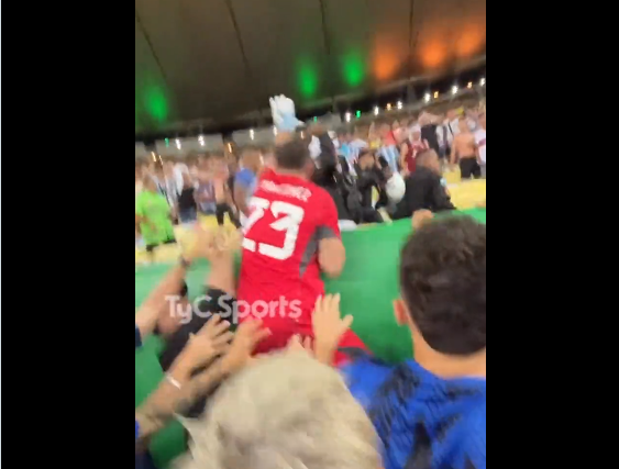 Una de las imágenes del partido, del inicio mejor dicho, fue la del portero argentino, Dibu Martínez, saltando a la grada para golpear a un policía brasileño: