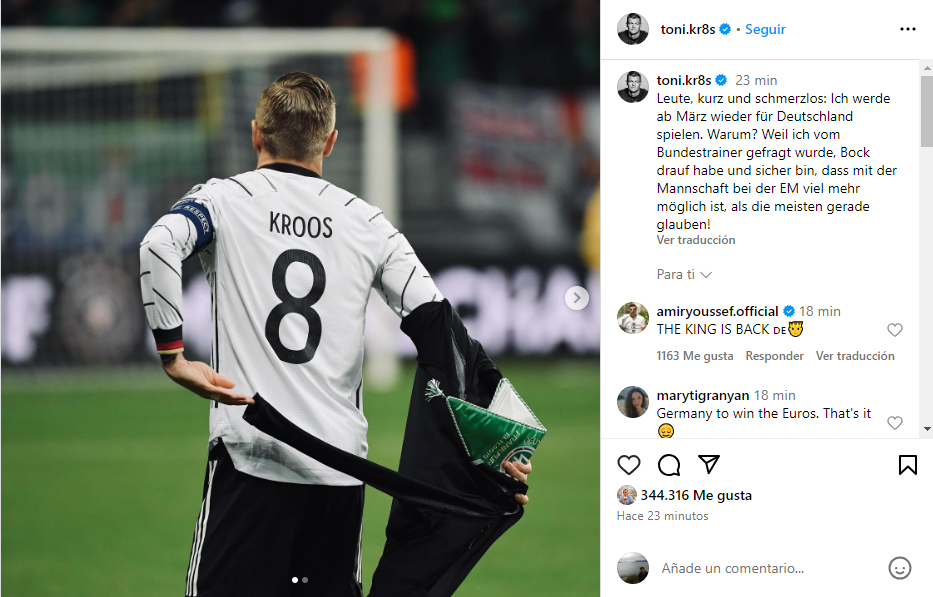 "Gente, cortito y rápido: volveré a jugar para Alemania en marzo. ¿Por qué? Porque me lo pidió el entrenador, estoy de humor para ello y estoy seguro que conmigo en el equipo en el Campeonato de Europa, es posible que la mayoría crea que podemos volver a hacer algo importante en este momento!", confirmó el propio Kroos en Instagram.