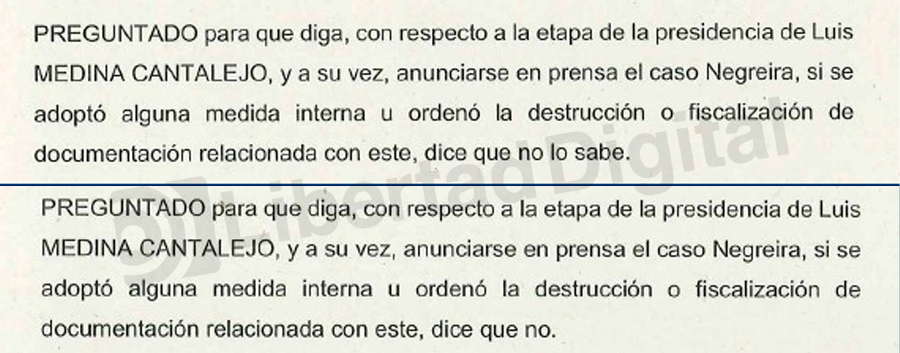 En la declaración como testigo del jefe de Contabilidad del CTA Isaac Hernández, a la que ha tenido acceso Libertad Digital, la Guardia Civil no se andaba con rodeos y formulaba la siguiente pregunta: "¿Con respecto a la etapa de la presidencia de Luis Medina Cantalejo, y a su vez, anunciarse en prensa el caso Negreira, se adoptó alguna medida interna u ordenó la destrucción o fiscalización de documentación relacionada con éste?". El jefe de Contabilidad del CTA aseguró que no lo sabía.