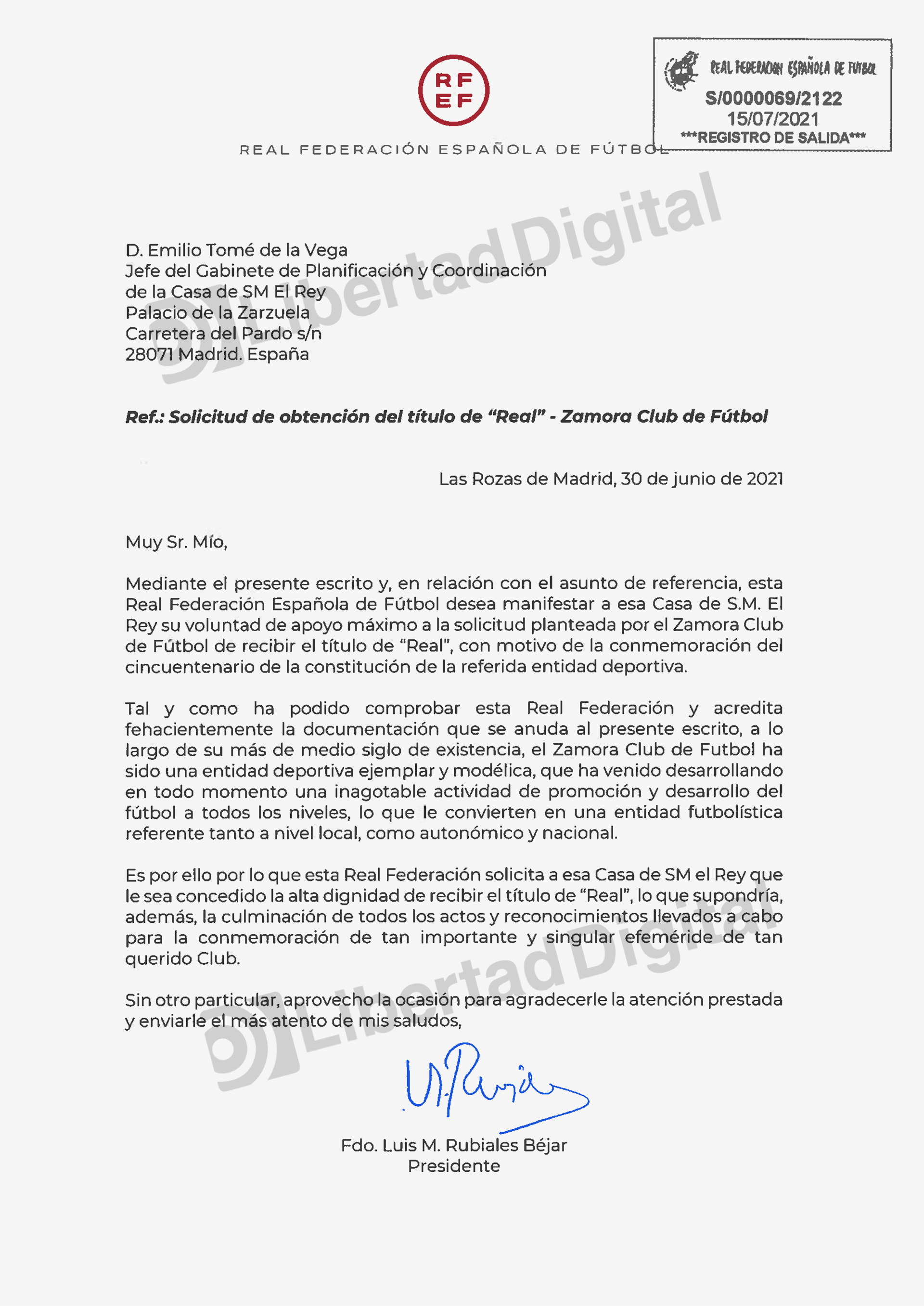La carta a la que ha tenido acceso Libertad Digital, desvelada por el senador popular Vicente Azpitarte, fue remitida por Rubiales a la Casa de S.M. el Rey el 30 de junio de 2021. La misiva con el encabezamiento "solicitud de obtención del título de ‘Real’–Zamora Club de Fútbol" señala que "mediante el presente escrito y, en relación con el asunto de referencia, esta Real Federación Española de Fútbol desea manifestar a esa Casa de S.M. el Rey su voluntad de apoyo máximo a la solicitud planteada por el Zamora Club de Fútbol de recibir el título de ‘Real’, con motivo de la conmemoración del cincuentenario de la constitución de la referida entidad deportiva".