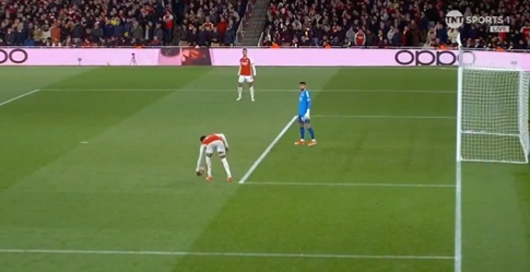 El portero saca, Gabriel la para con la mano, la coge y se la devuelve al portero. Penalti claro. Por mano. El árbitro no pitó nada. Harry Kane se volvió loco pidiendo pena máxima, pero nadie hizo nada desde el estamento arbitral.