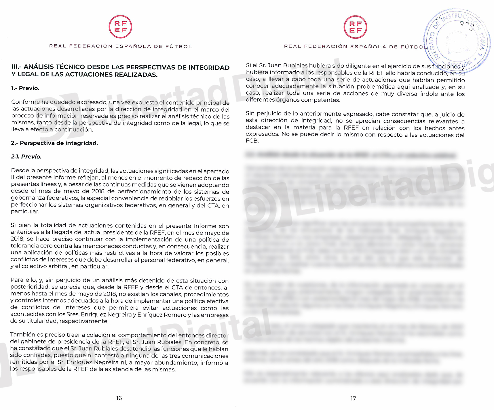 "Se ha constatado que el Sr. Juan Rubiales desatendió las funciones que le habían sido confiadas, puesto que ni contestó a ninguna de las tres comunicaciones remitidas por el Sr. Enríquez Negreira ni, a mayor abundamiento, informó a los responsables de la RFEF de la existencia de las mismas. Si el Sr. Juan Rubiales hubiera sido diligente en el ejercicio de sus funciones y hubiera informado a los responsables de la RFEF ello habría conducido, en su caso, a llevar a cabo toda una serie de actuaciones que habrían permitido conocer adecuadamente la situación problemática aquí analizada y, en su caso, realizar toda una serie de acciones de muy diversa índole ante los diferentes órganos competentes", concluía.
