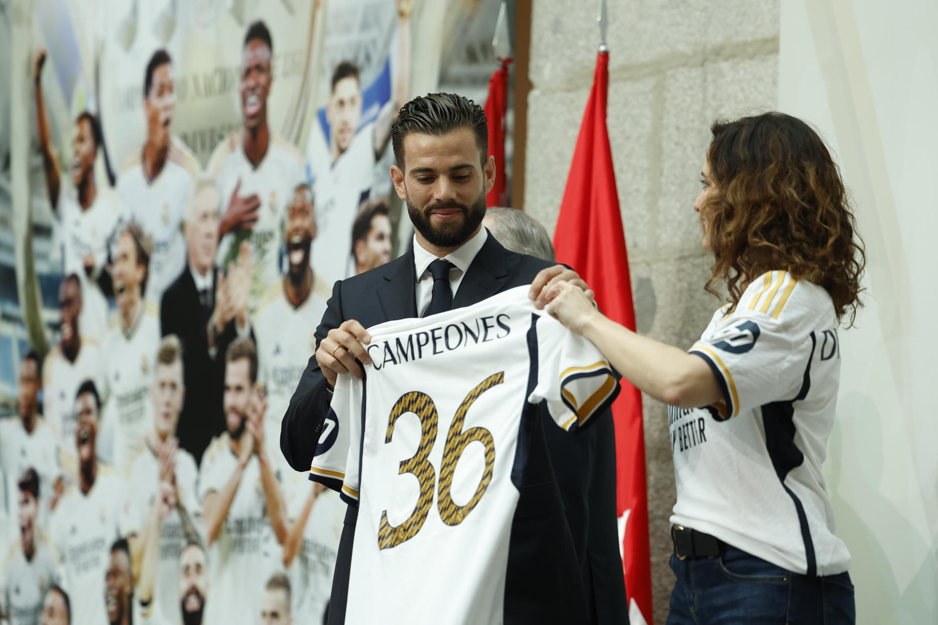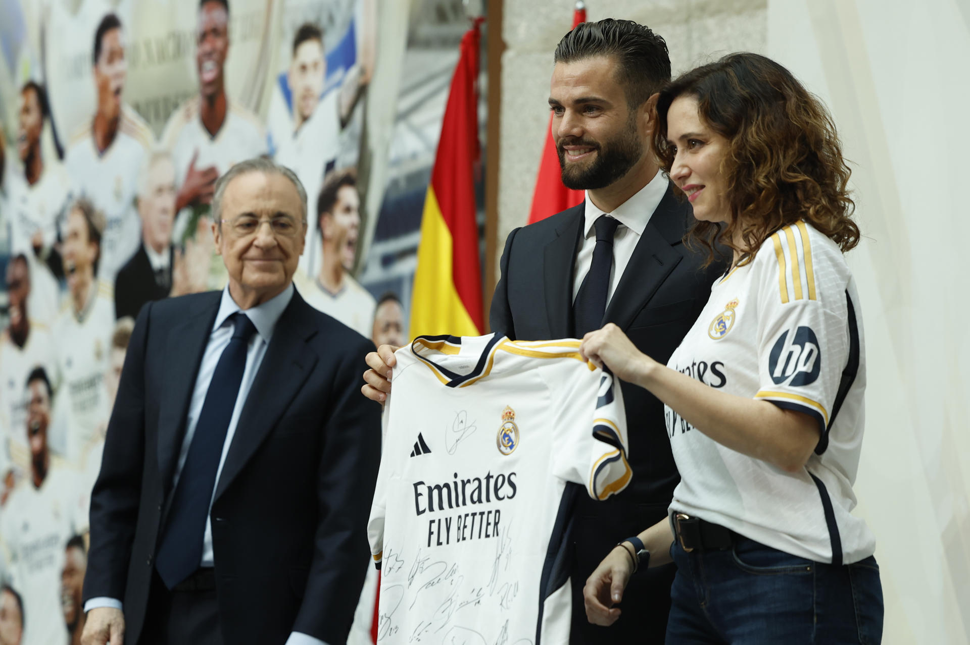 Como es habitual, Florentino Pérez y el capitán Nacho le regalaron a Ayuso una camiseta del curso actual con su nombre y apellidos.