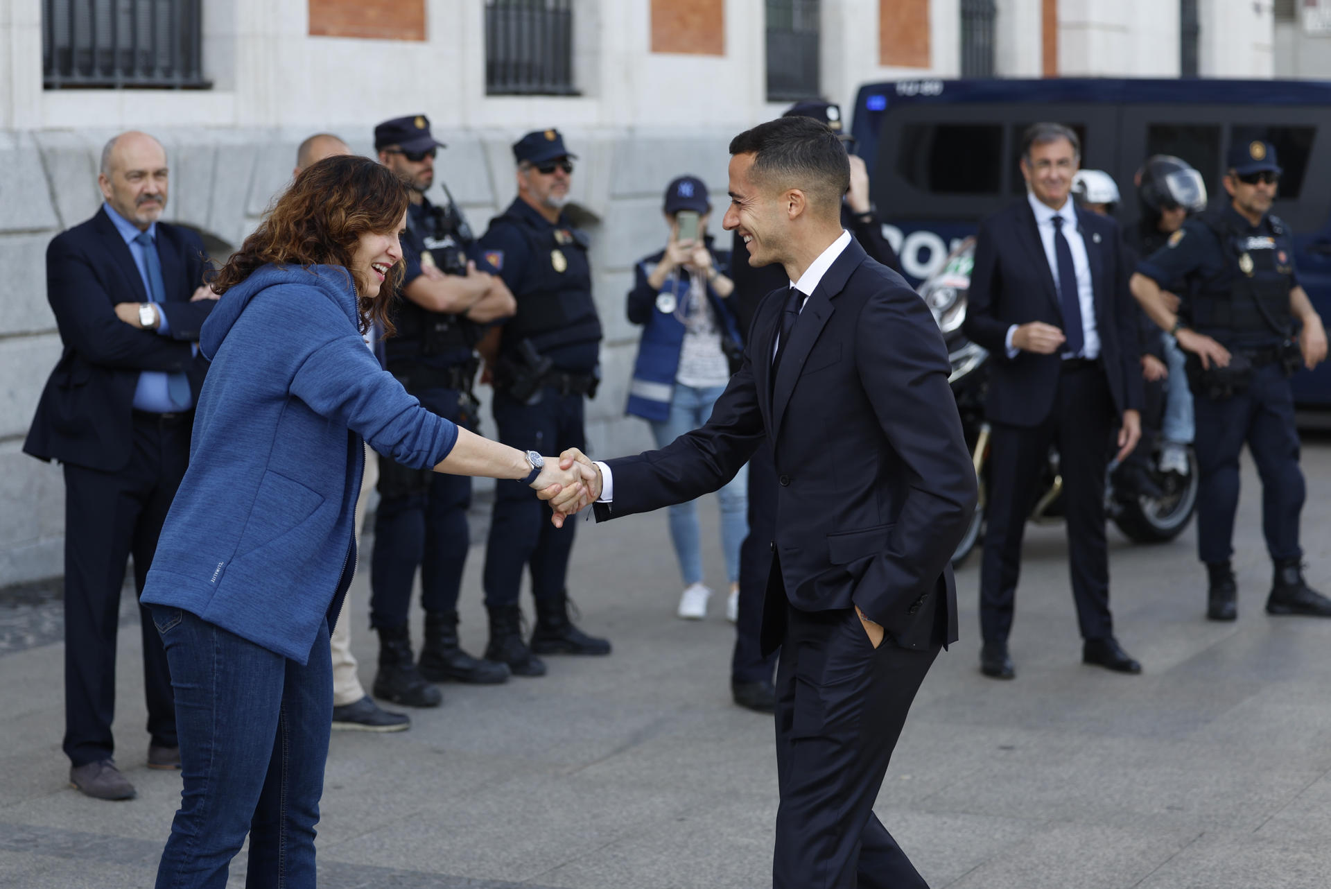 Según bajaban del autobús, todos bien trajeados, Ayuso los iba dando la mano. Lucas Vázquez, entre ellos.