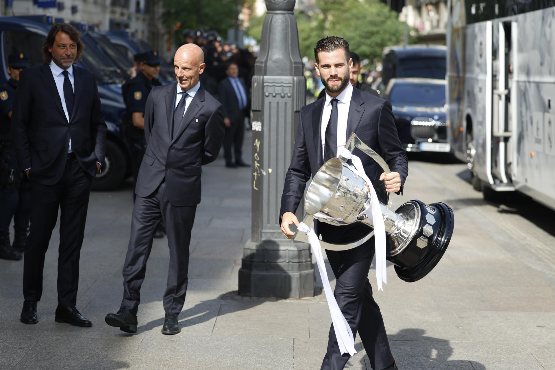 Nacho, como capitán, bajó con el trofeo de la Liga en su llegada a Sol.