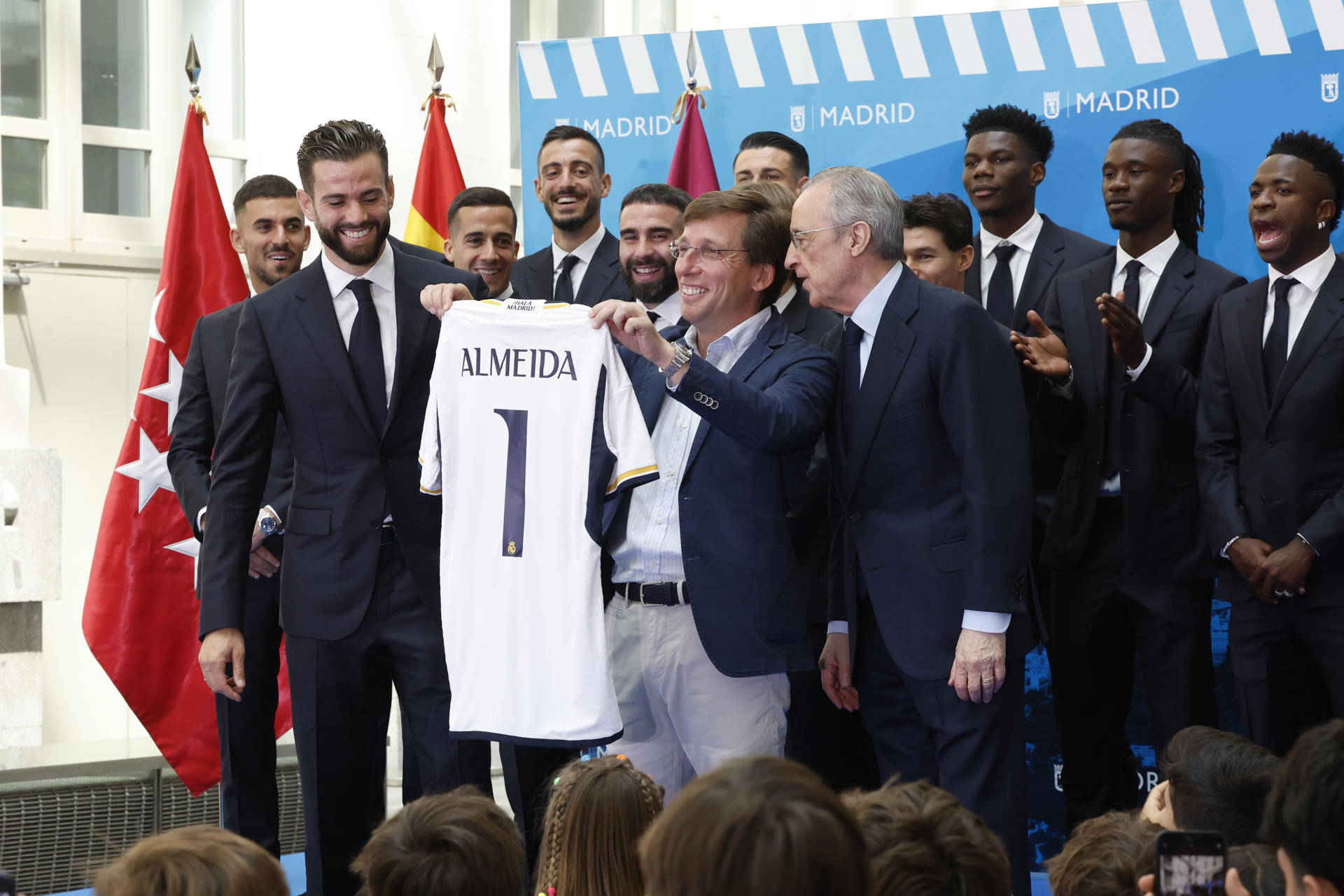 El alcalde de Madrid, Jose Luis Martínez Almeida, rojiblanco confeso, posó con una camiseta del Real Madrid.